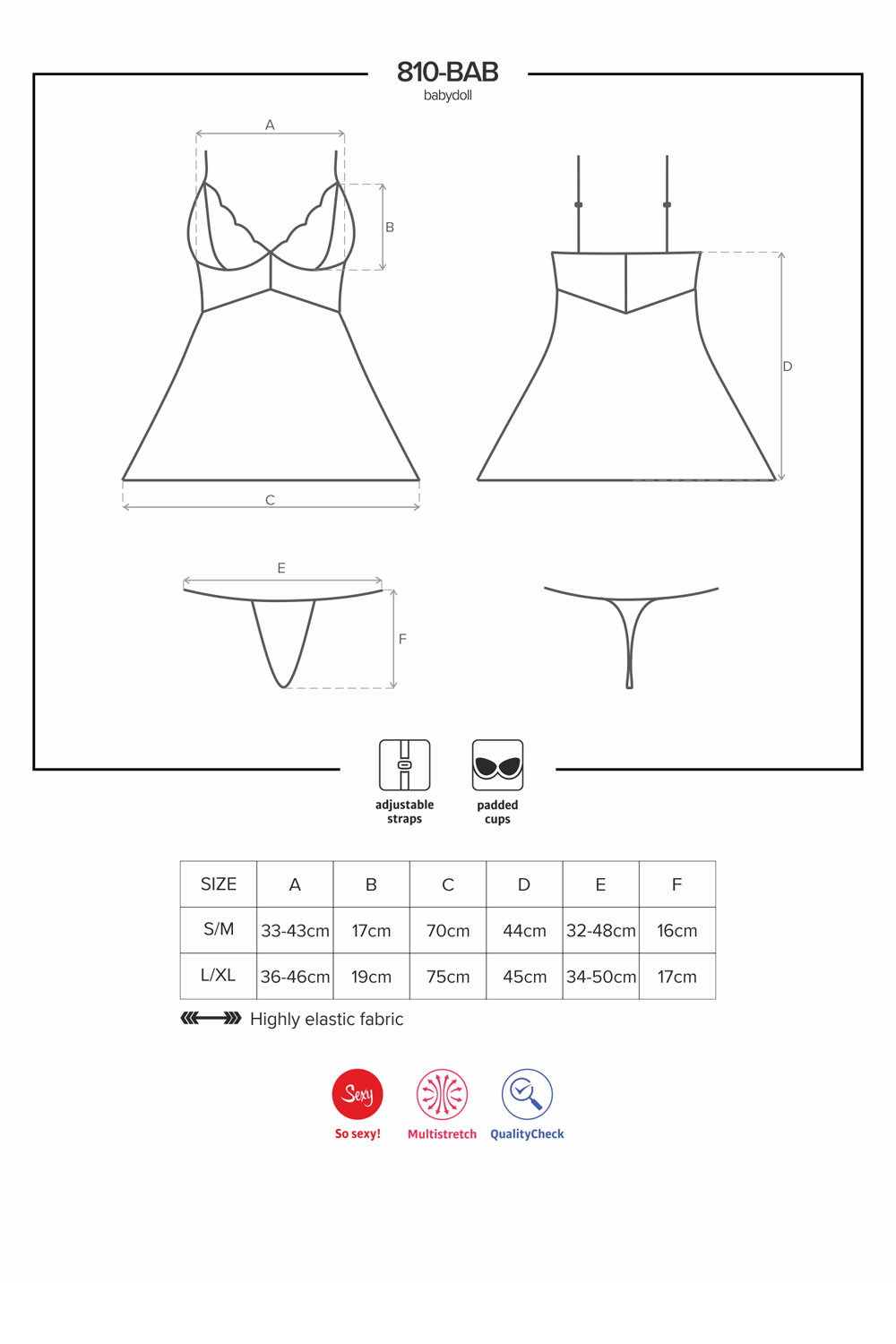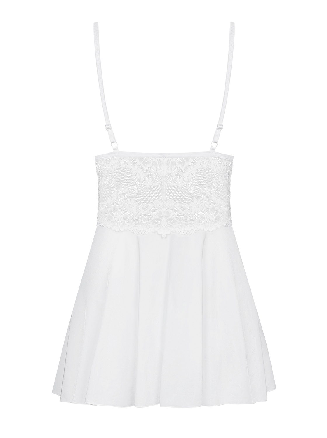 Entzückendes, weißes Babydoll mit luftig weitem Schnitt und verstellbaren Trägern für eine perfekte Passform. Die weichen, gepolsterten Cups und der Bereich unterhalb der Brust sind mit floraler Spitze geschmückt. Ein weißer, glatter String ist inklusive. Angenehmes und elastisches Material.