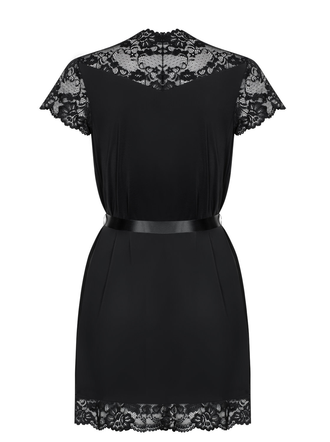 Verführerischer Peignoir aus blickdichtem Material mit sinnlichen Spitzendetails und kurzen Ärmeln. Mit breitem Satingürtel, der zusammengebunden die Taille betont. Das Material ist sehr angenehm und elastisch.