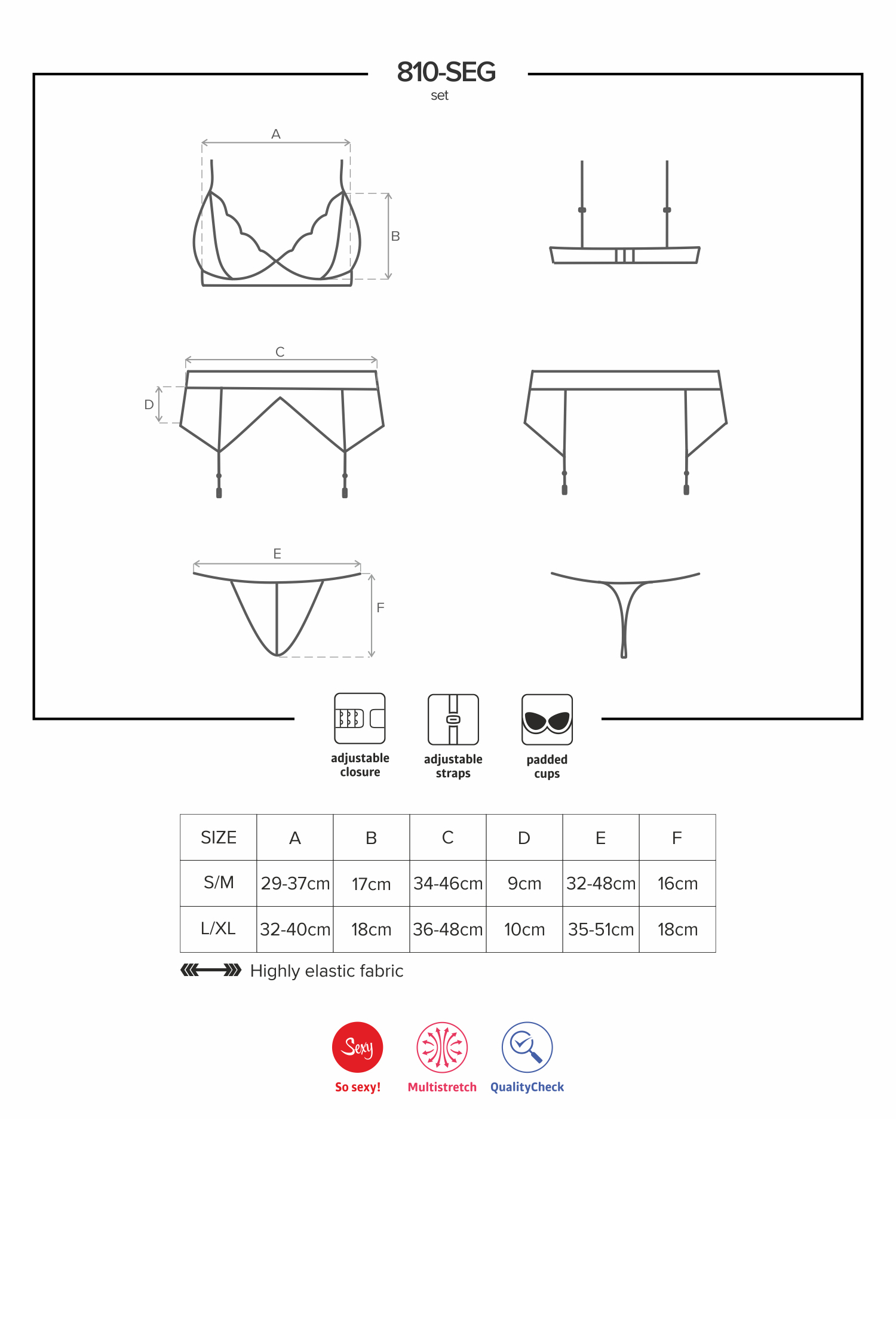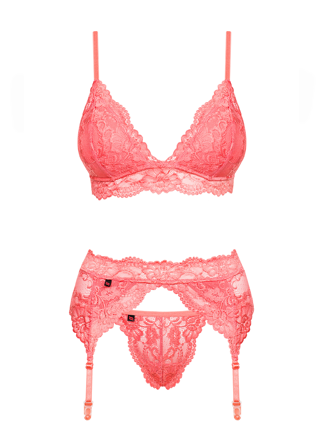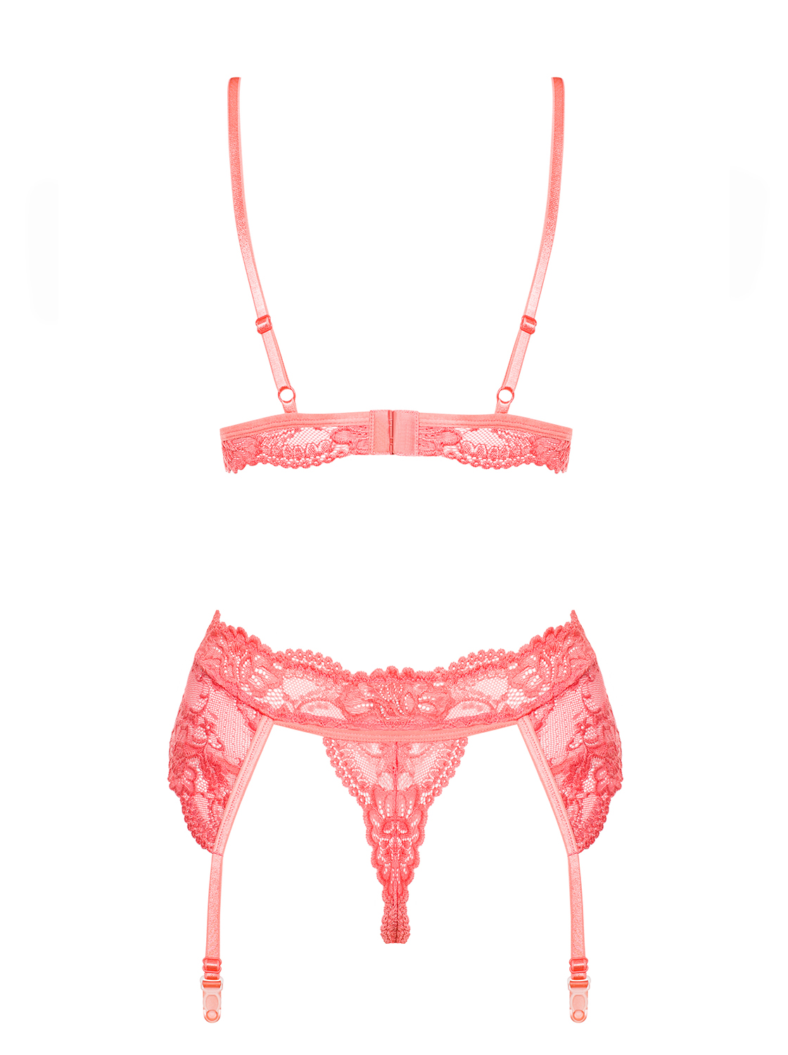 Verführerisches, korallfarbenes Set mit auffälliger Spitzenverzierung bestehend aus BH, Strumpfhaltergürtel und String. Der BH hat gepolsterte Cups, verstellbare Träger und einen Verschluss für eine perfekte Passform. Der Strumpfhaltergürtel hat verstellbare Strumpfhalter. Weiches und elastisches Material.