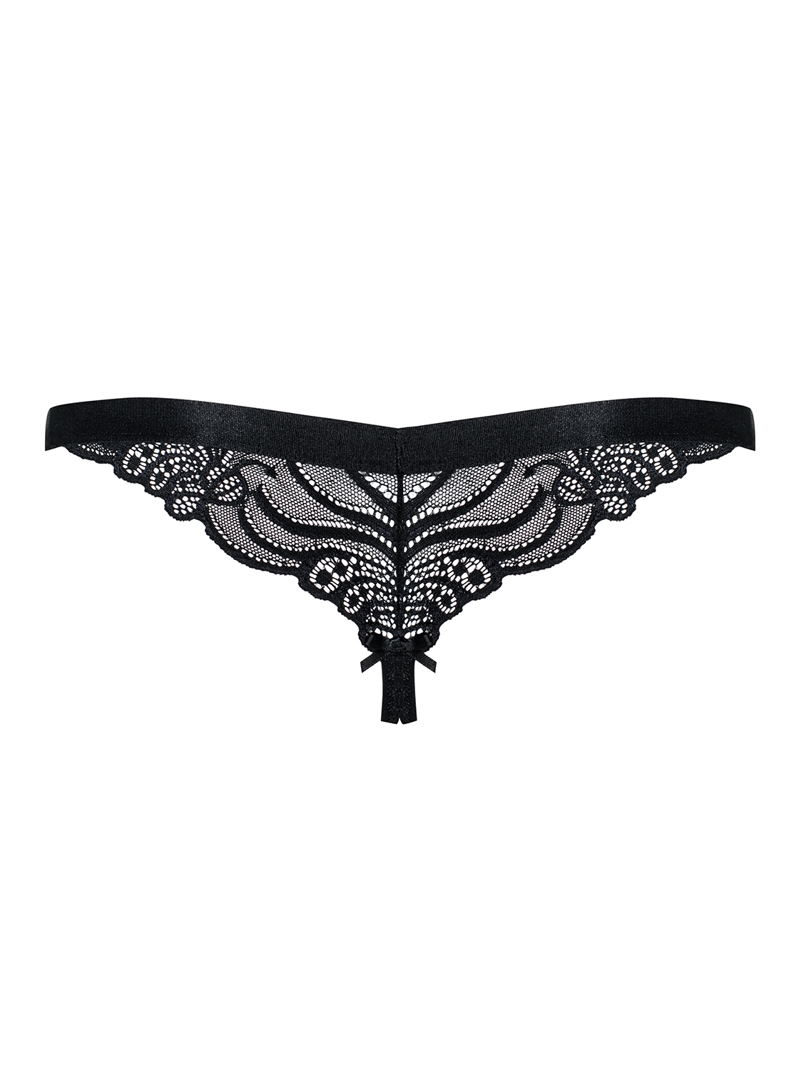 828-THC-1 String ouvert schwarz von Obsessive Verführerischer Spitzen-String mit schönen Motiven und elastischem Gummizug für tollen Tragekomfort. Mit offenem Schritt und süßer Schleife am Po. Elastisches und passgenaues Material.