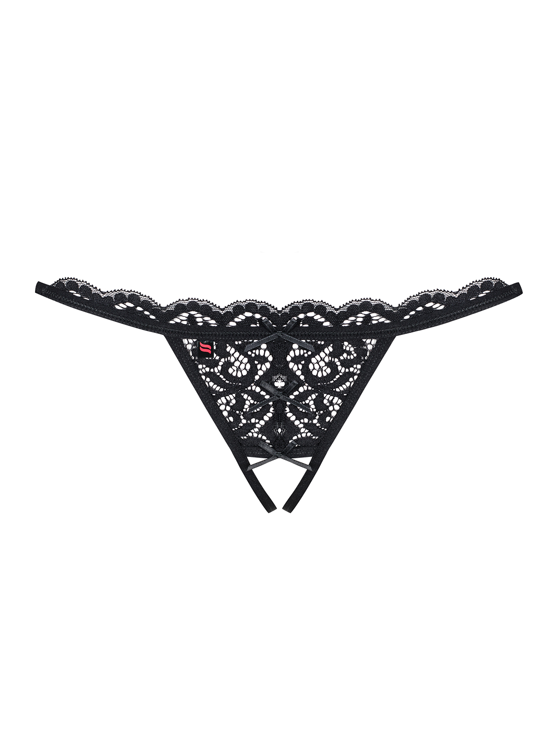 831-THC-1 String ouvert schwarz von Obsessive Spitzen-String mit offenem Schritt und verführerischen Ausschnitten, die mit Schleifen geschmückt sind. Mit Kreuzriemchen und Satinschleife auf der Rückseite. Elastisches und passgenaues Material.