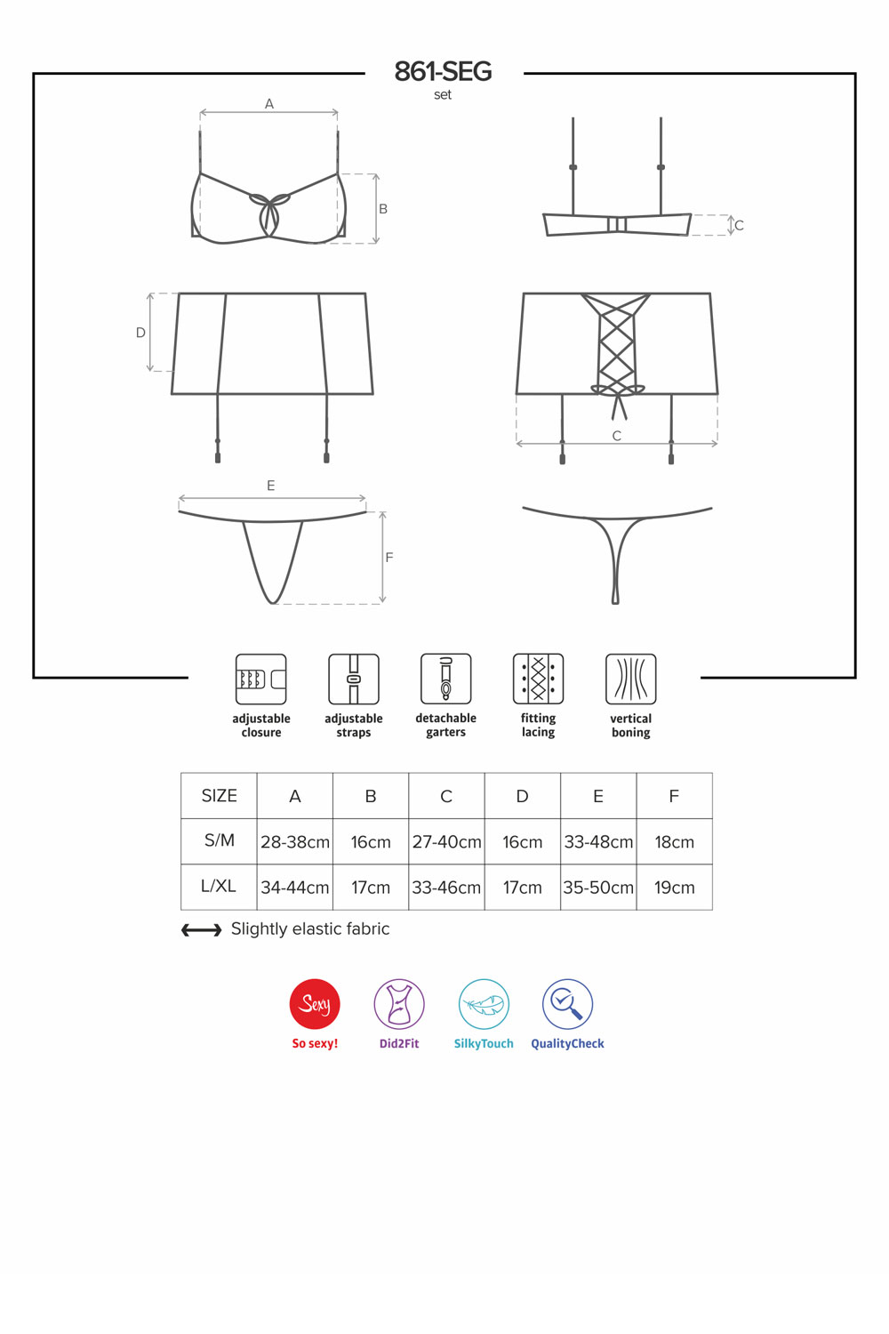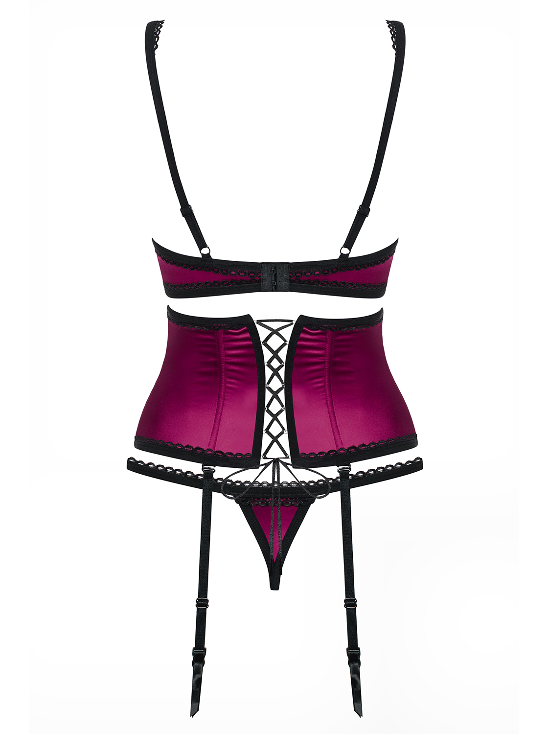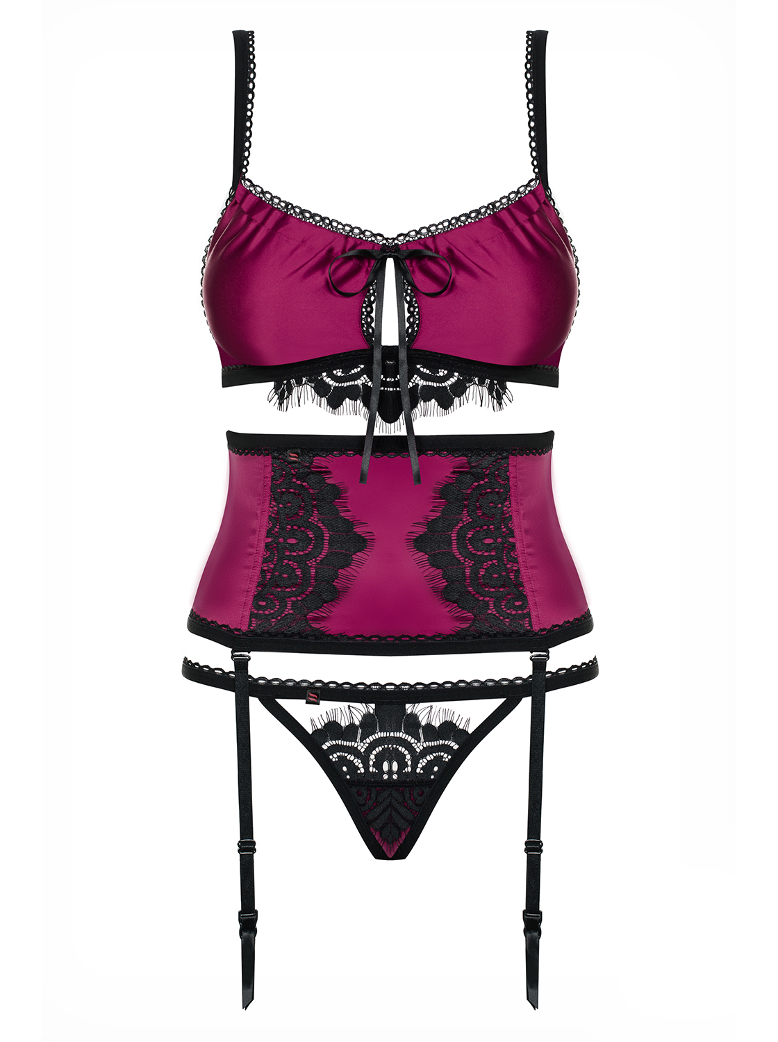 Atemberaubendes Set aus seidig schimmerndem Material in fuchsia mit eleganter, schwarzer Wimpernspitze. Ein BH mit verstellbaren Trägern und mehrstufigem Verschluss für eine perfekte Passform sowie einer verführerischen Schnürung am Dekolleté,. Ein Strumpfhaltergürtel mit vertikalen Nähten, die Ihre Figur betonen und mit einer Schnürung auf der Rückseite. Die Strumpfhalter sind abnehmbar. Passender String inklusive. Die abgebildeten Strümpfe sind nicht im Lieferumfang enthalten. Schönes und weiches Material.