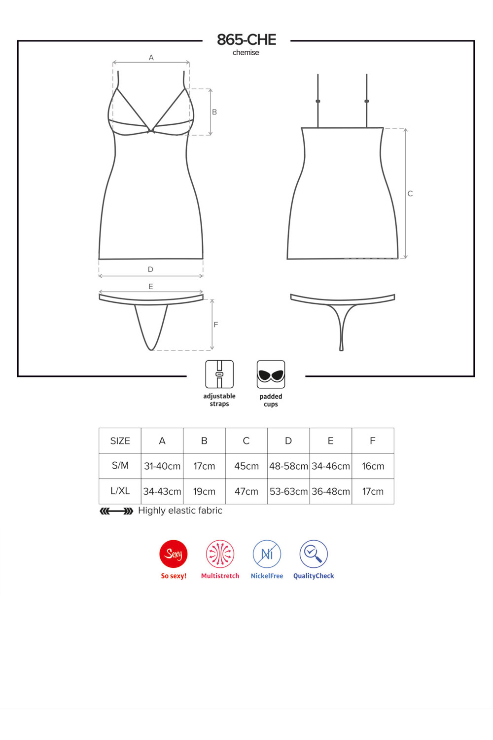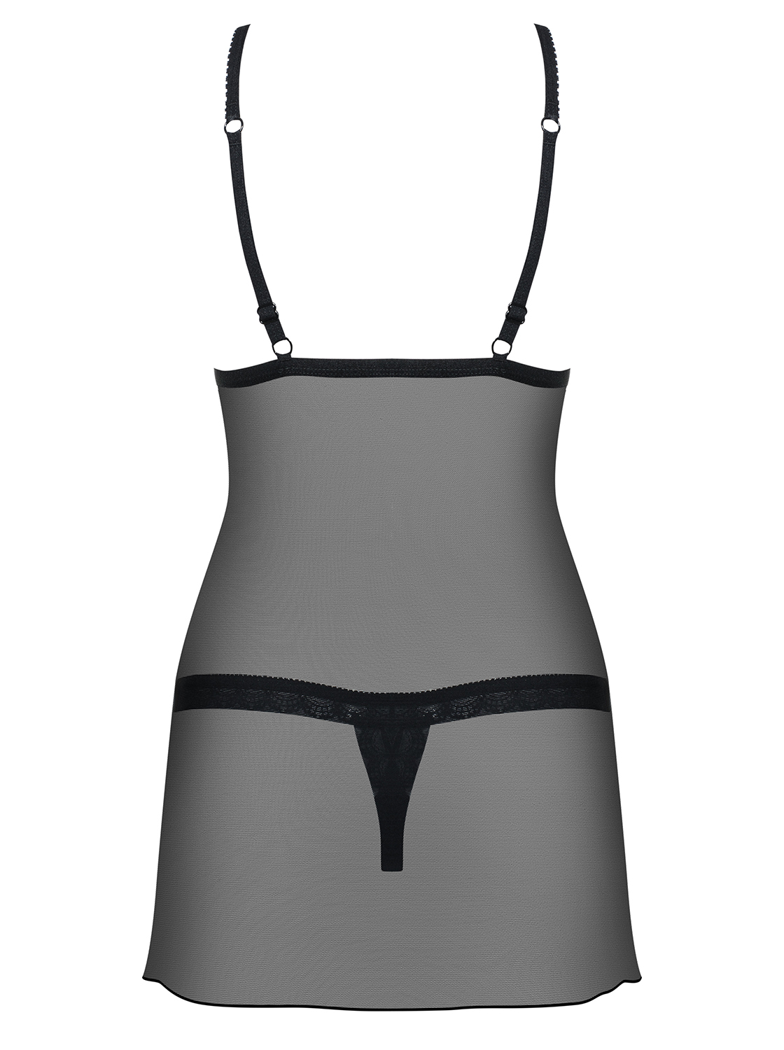 Sexy Chemise aus transparentem Mesh mit verstellbaren Trägern und gepolsterten, offenen Cups mit einzigartigem Spitzendesign. Eine winzige Schleife mit glänzendem Schmuckelement ziert das Dekolleté,. Passender String inklusive. Zartes und elastisches Material.