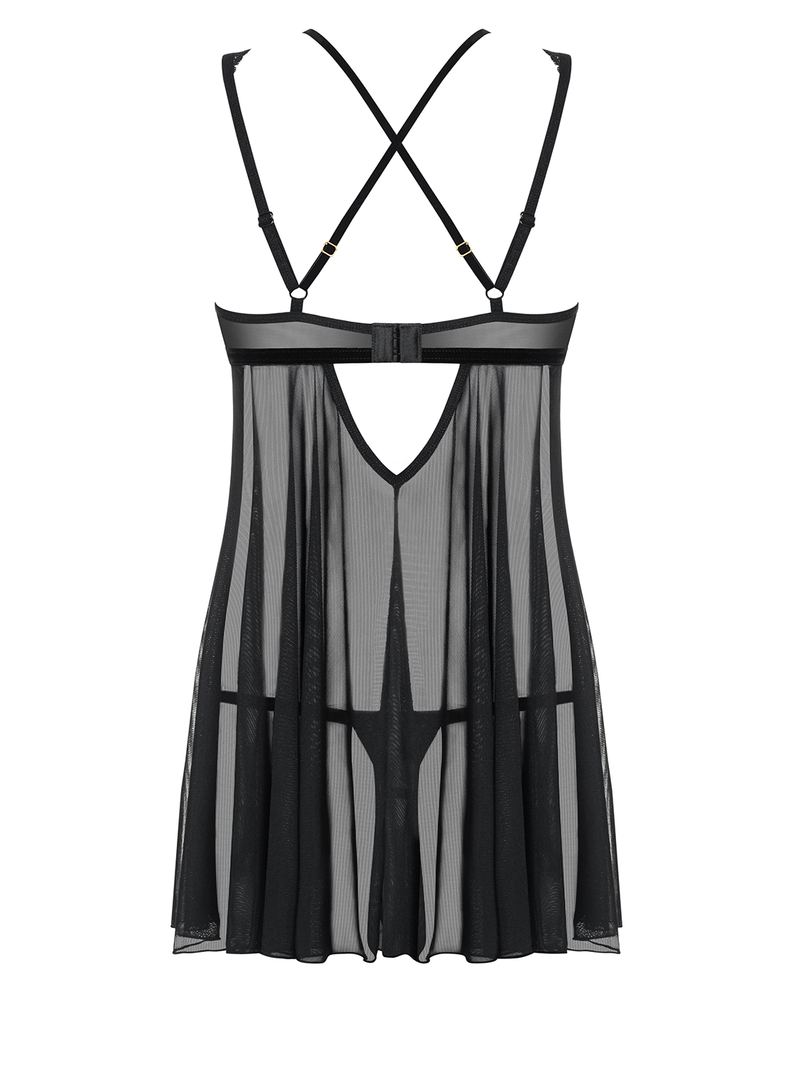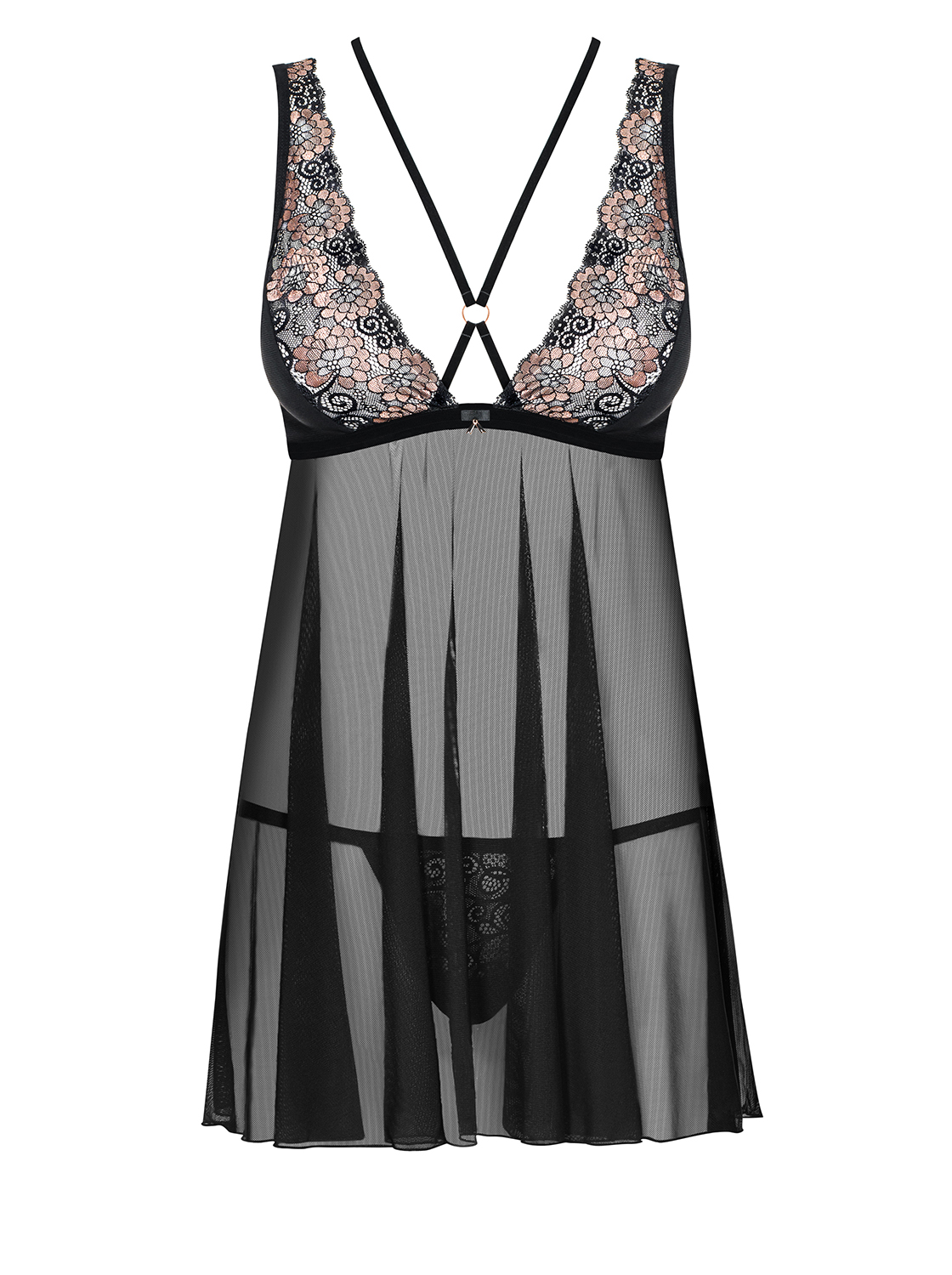 Bezauberndes und luftiges Babydoll mit verstellbaren Kreuzträgern, mehrstufigem Verschluss mit Rückenausschnitt und eleganter Spitze. Mit goldenen Blumen und sexy Riemchen mit Schmuckringdetail am Dekolleté,. Der Busen wird durch den Gummizug unter den Cups und einem winzigen Schmuckdetail betont. Passender String inklusive. Samtig weiches und elastisches Material.