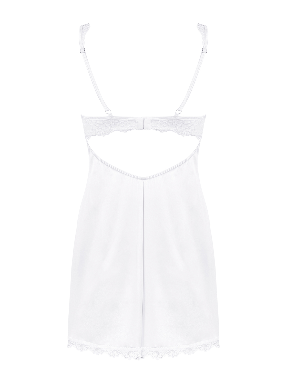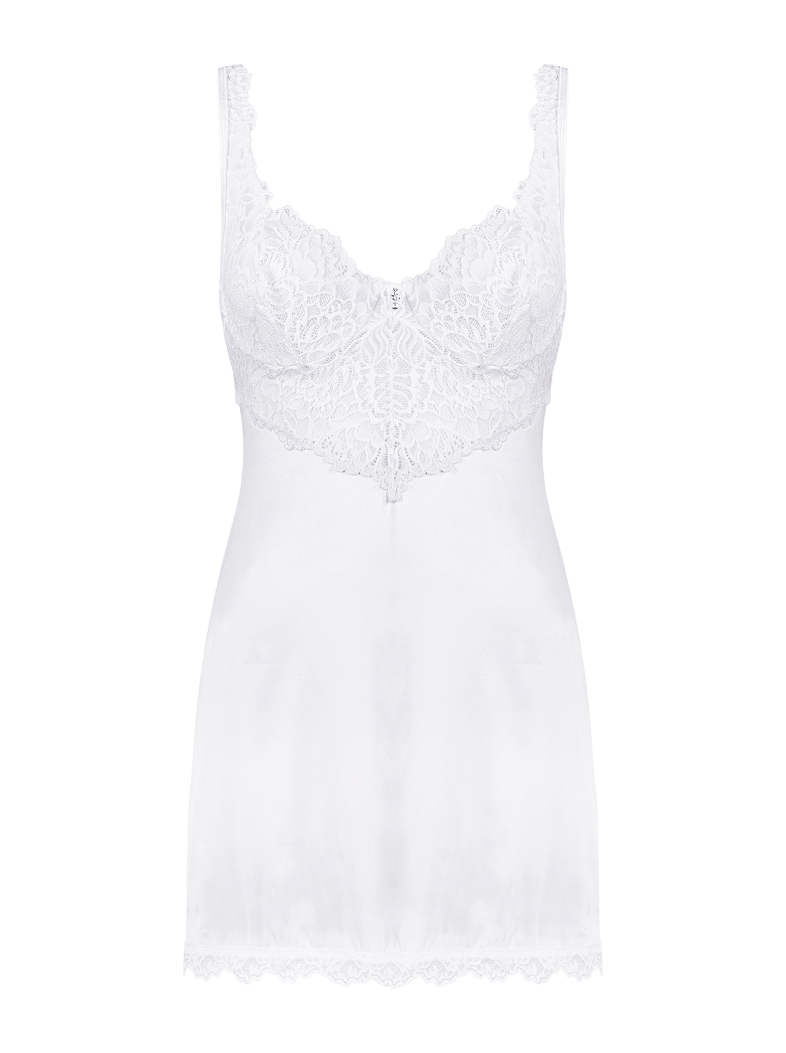 Weißes Chemise aus weichem und elastischem Material mit eleganter Spitze an der Brust, den Trägern und dem Saum. Der verführerische Schnitt betont Ihre Silhouette. Verstellbare Träger, ein Rückenverschluss und Bügelcups sorgen für eine perfekte Passform. Zwischen den Cups funkelt ein schönes Schmuckdetail. Passender String inklusive.