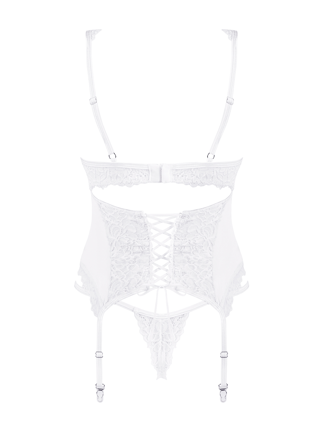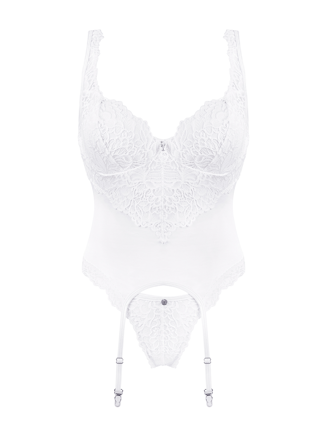 Bezaubernde, weiße Corsage mit eleganter Spitze und einem figurbetonten Schnitt. Mit Bügel-Cups, verstellbaren Riemchen und BH-Verschluss für eine perfekte Passform. Außerdem mit einer sexy Rückenschnürung und verstellbaren Strumpfhaltern. Passender String mit glänzendem Schmuckelement inklusive.