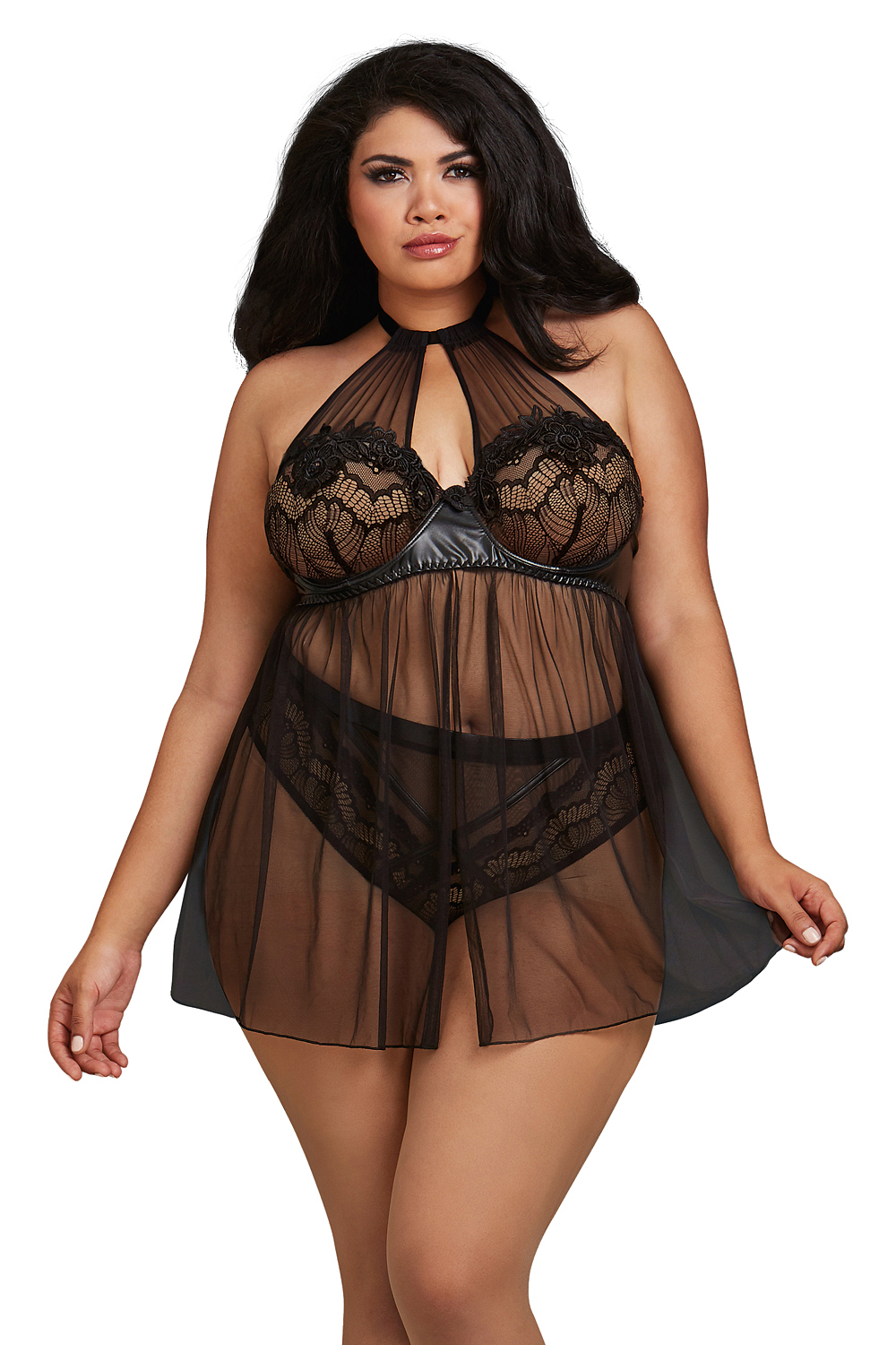 Hochgeschlossenes Babydoll aus Mesh und Spitze. Mit ungefütterten Bügel-Cups, sexy Kunstlederdetails und verstellbaren Verschlüssen auf der Rückseite. Passender String inklusive. Verpackt in einer wiederverschließbaren PVC-Hülle.
