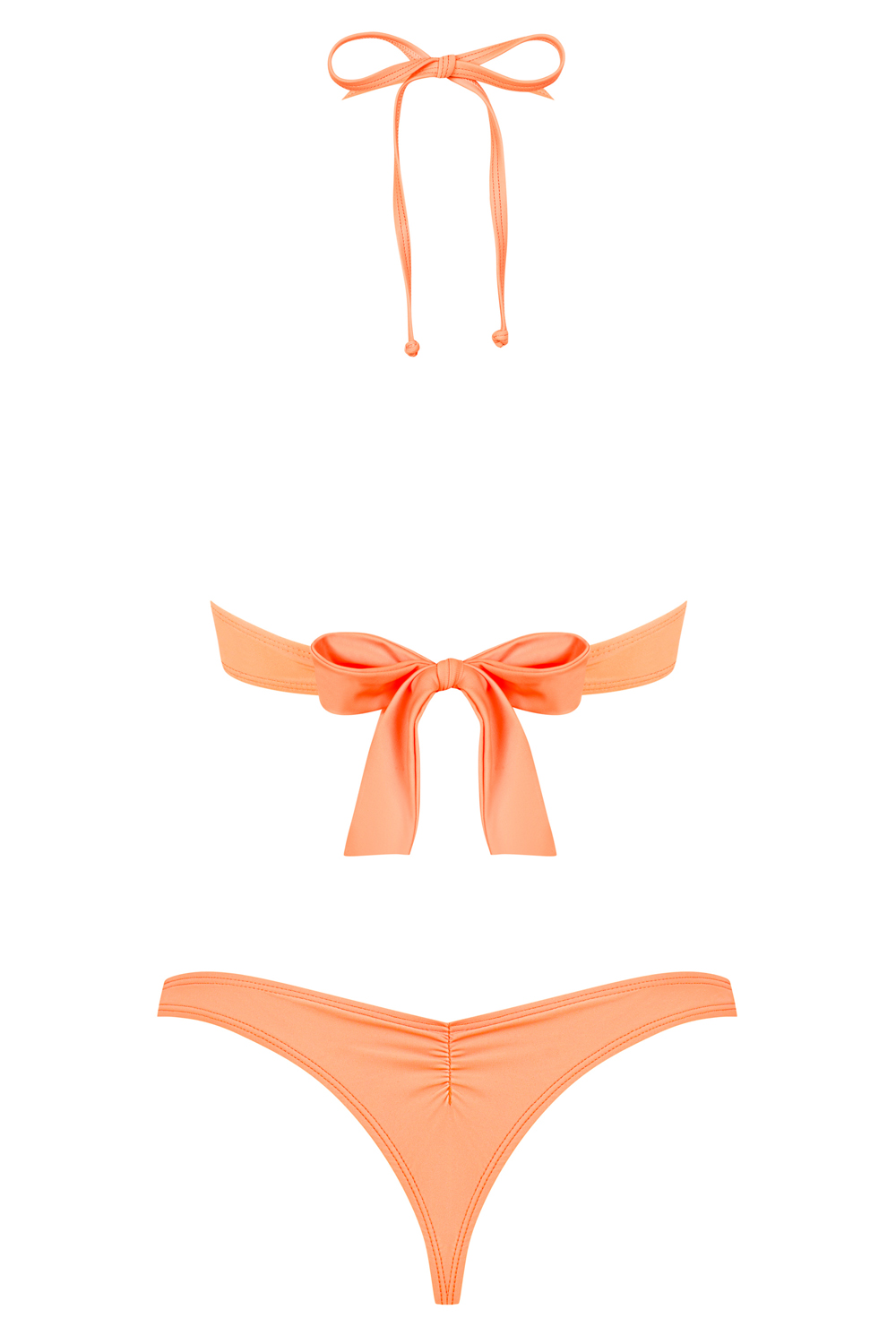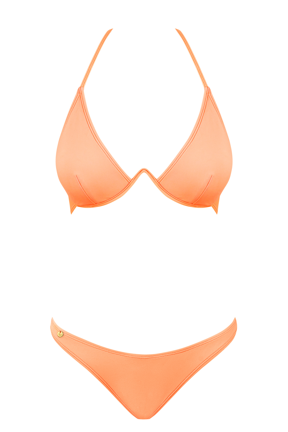 Einzigartiger Bikini in einem sommerlichen Korallton. Das Oberteil mit Bügel-Cups betont die Brust, Neckholder- und Rückenschnürung sorgen für eine bequeme Passform. Das sexy geschnittene Unterteil setzt Beine und Po perfekt in Szene. Elastisches und schnell trocknendes Material.