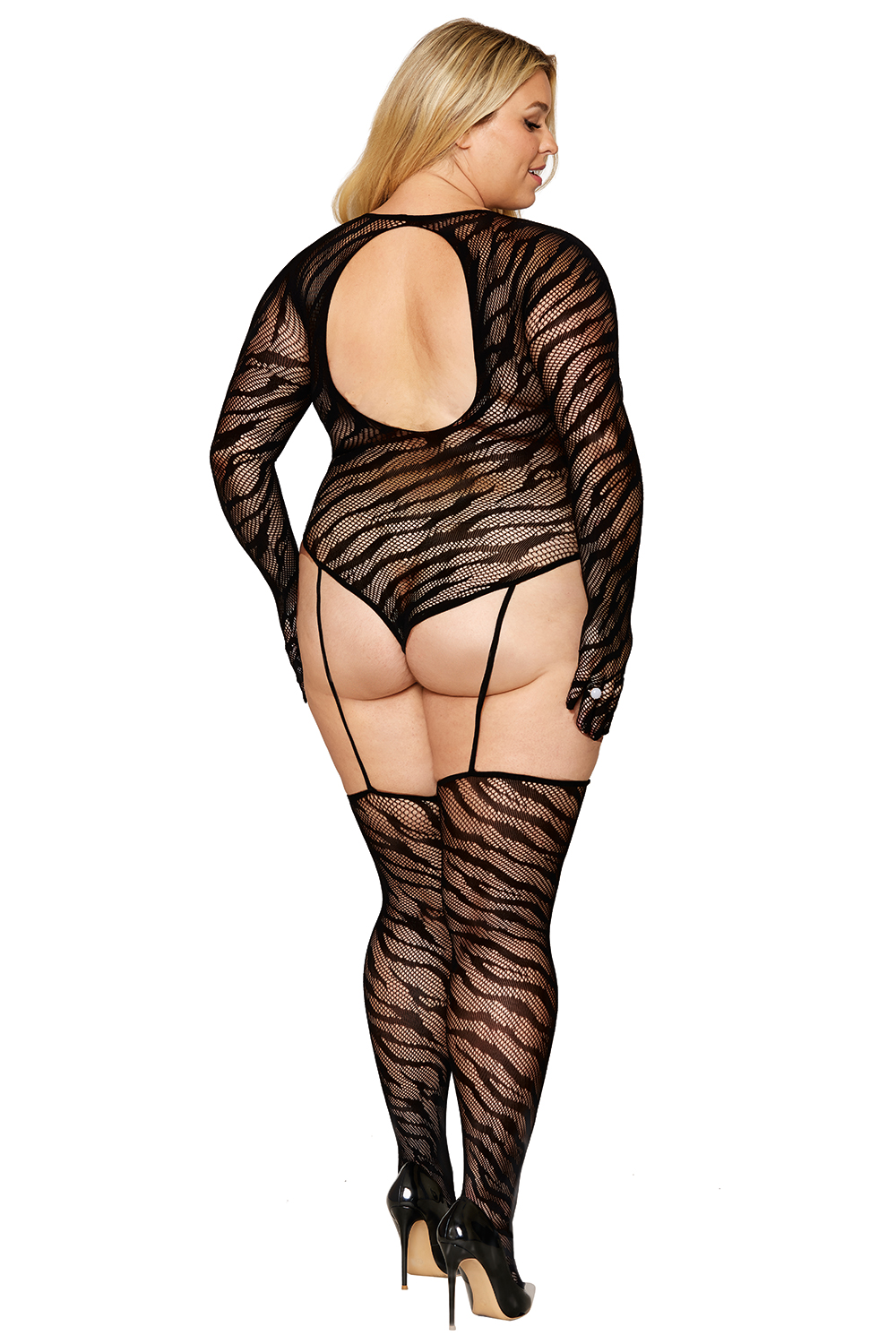 Schwarzer Bodystocking aus elastischem Netzmaterial mit Zebramuster, langen Ärmeln, integrierten Fingerhandschuhen und rundem Rückenausschnitt. Mit befestigten Strumpfhaltern und passenden Strümpfen. Gürtel und Hut sind nicht inklusive.