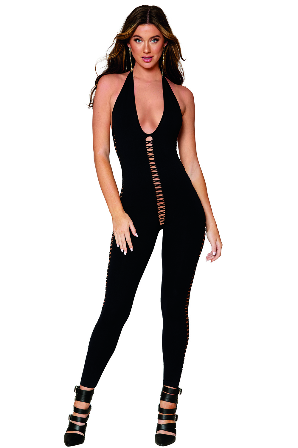 Blickdichter, gestrickter Bodysuit mit tiefem Ausschnitt. Mit durchgehenden Kreuzverzierungen vorne, hinten und an den Seiten. Mit verstellbarem Neckholder. Der Gürtel ist nicht inklusive.
