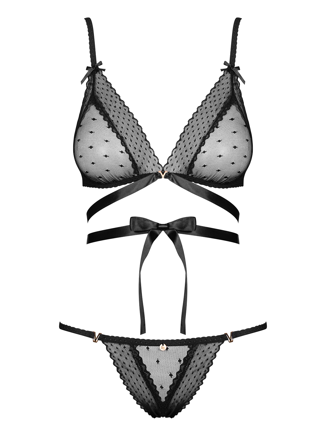 Fantastisches Set aus transparentem Material in schwarz mit dezenten Punkten und einer Satinschnürung an der Taille. Ein BH mit einem Schmuckdetail zwischen den Softcups und verstellbaren Trägern, die mit Schleifen verziert sind. Dazu passende Höschen mit einem Anhänger und Schmuckdetails an den Seiten sowie einer Schleife auf der Rückseite. Weiches und elastisches Material.