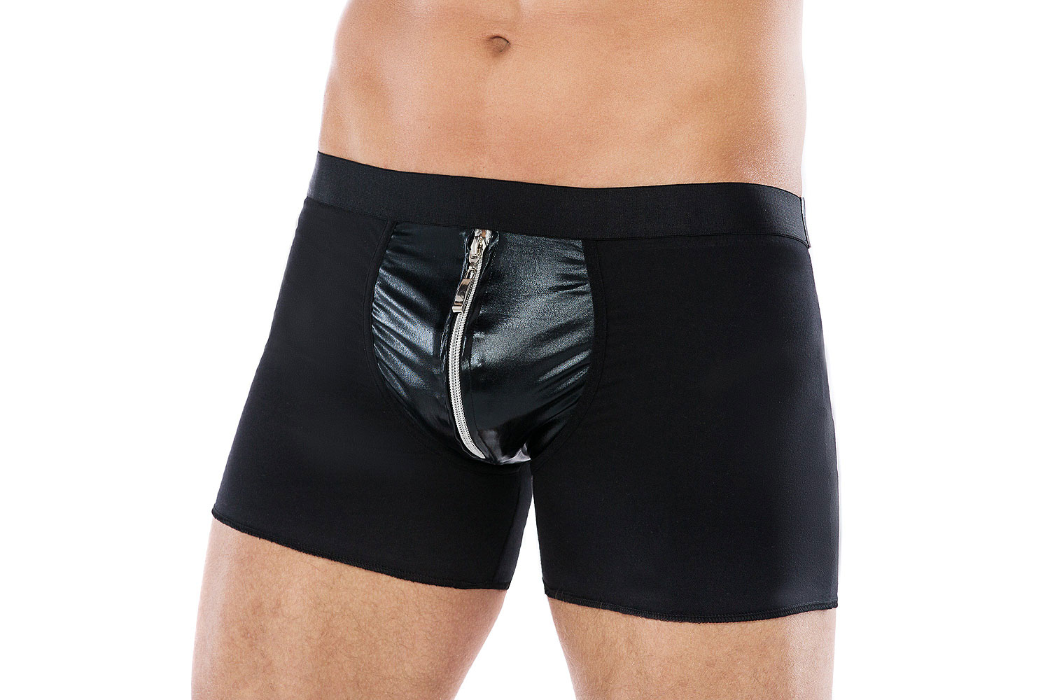 Boxershorts aus weicher, schwarzer Baumwolle kombiniert mit schwarzem Wet-Look-Material. Vorne mit Reißverschluss versehen.