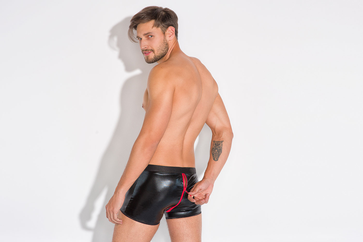 Schwarze Boxershorts aus Wet-Look-Material. Mit einem langen, roten Reißverschluss, der von vorn bis hinten reicht. In exklusiver, neutraler Geschenkverpackung in mattschwarz!