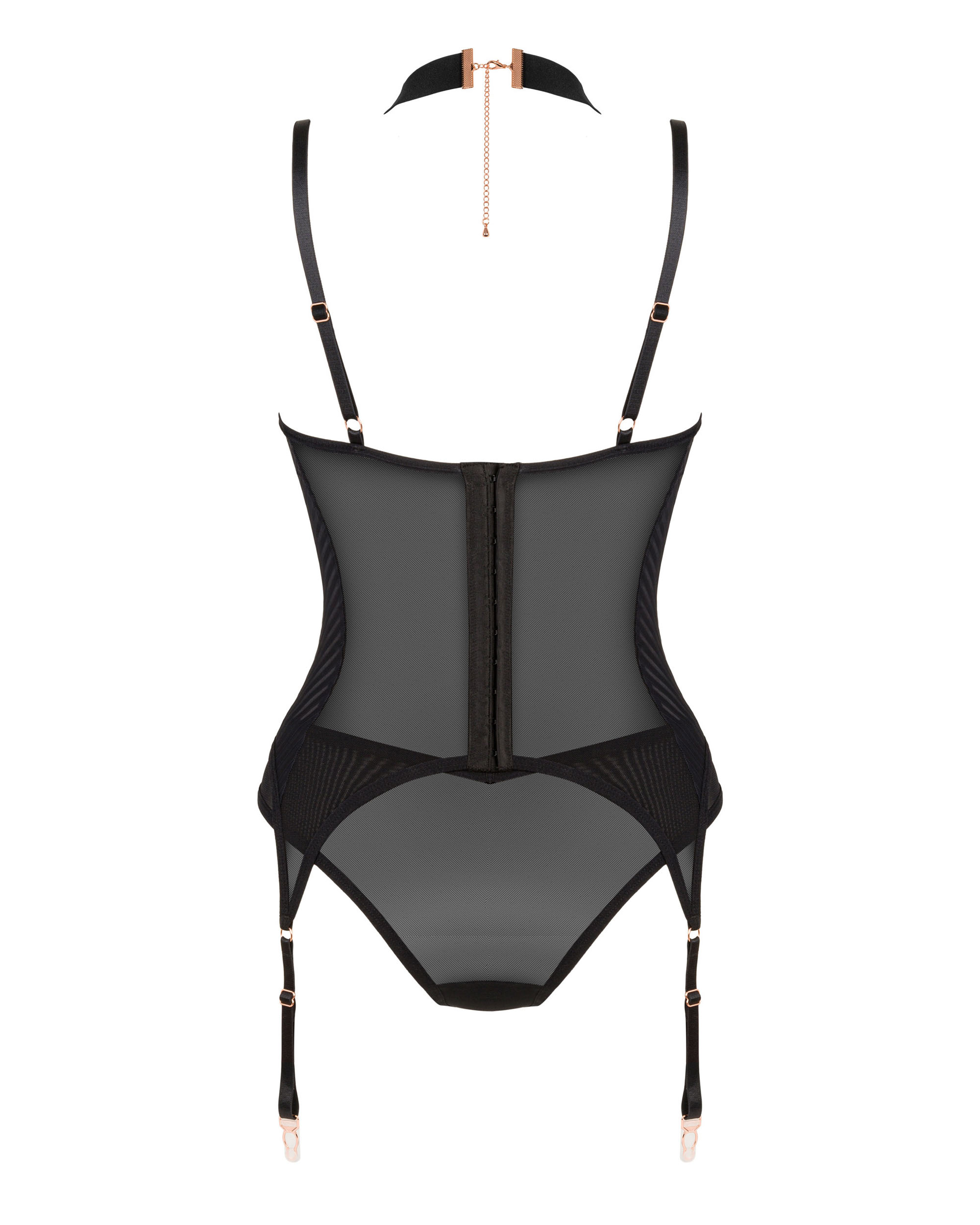 Corsage und Slip aus durchscheinendem Mesh und gestreiftem Material. Mit Bügelcups, verstellbaren Trägern und Strumpfhaltern für eine perfekte Passform. Der Choker wird im Nacken mit einer Schmuckkette befestigt. Mit einem abnehmbaren Riemchen und Metallring zwischen den Brüsten. Weiches und elastisches Material.