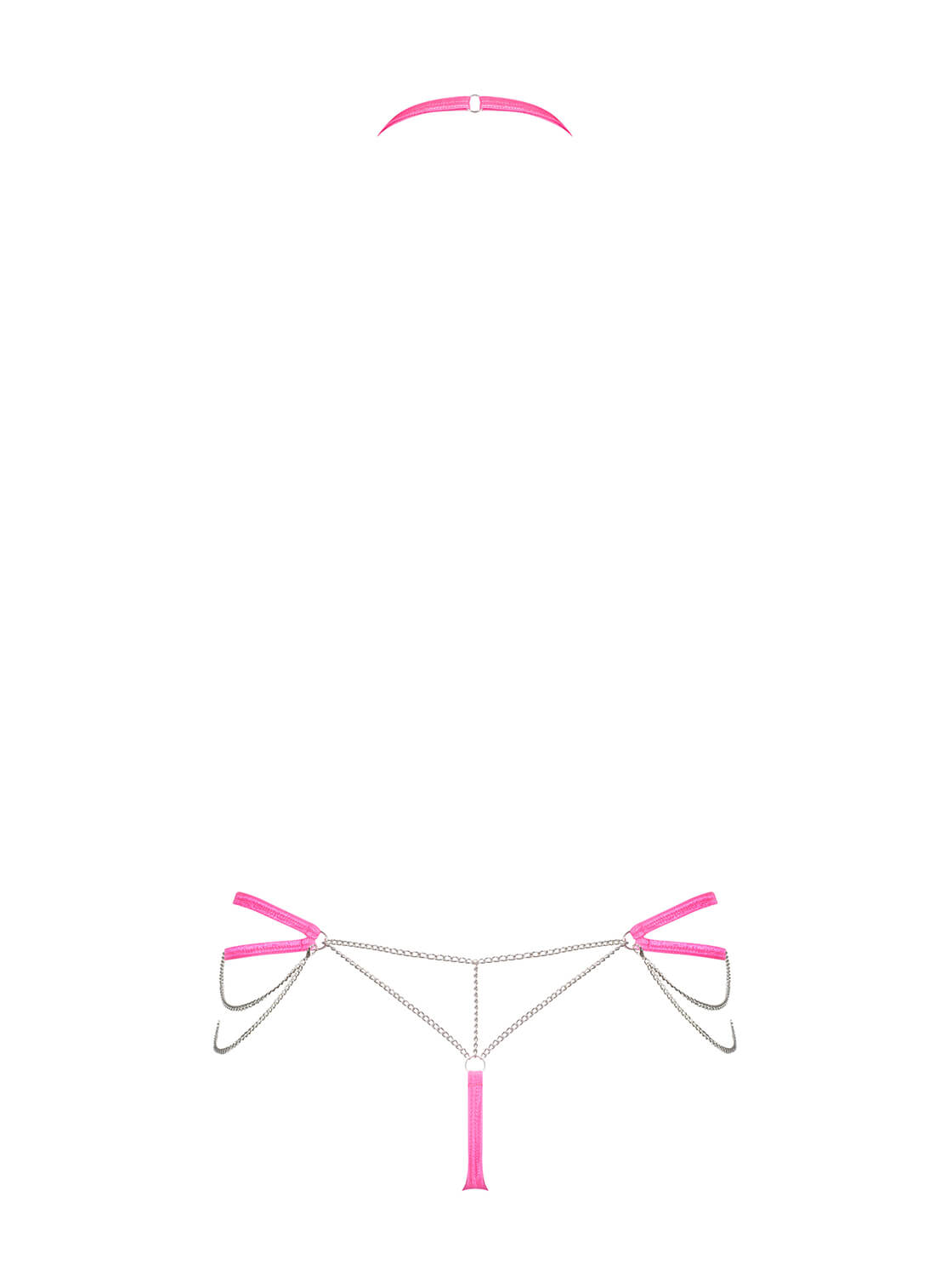 Sexy String mit Doppelriemchen in neonpink, der mit abnehmbaren Ketten mit einem elastischen, verstellbaren Neckholder verbunden ist. Die Ketten verlaufen von der Brust bis zur Hüfte und dem Po.