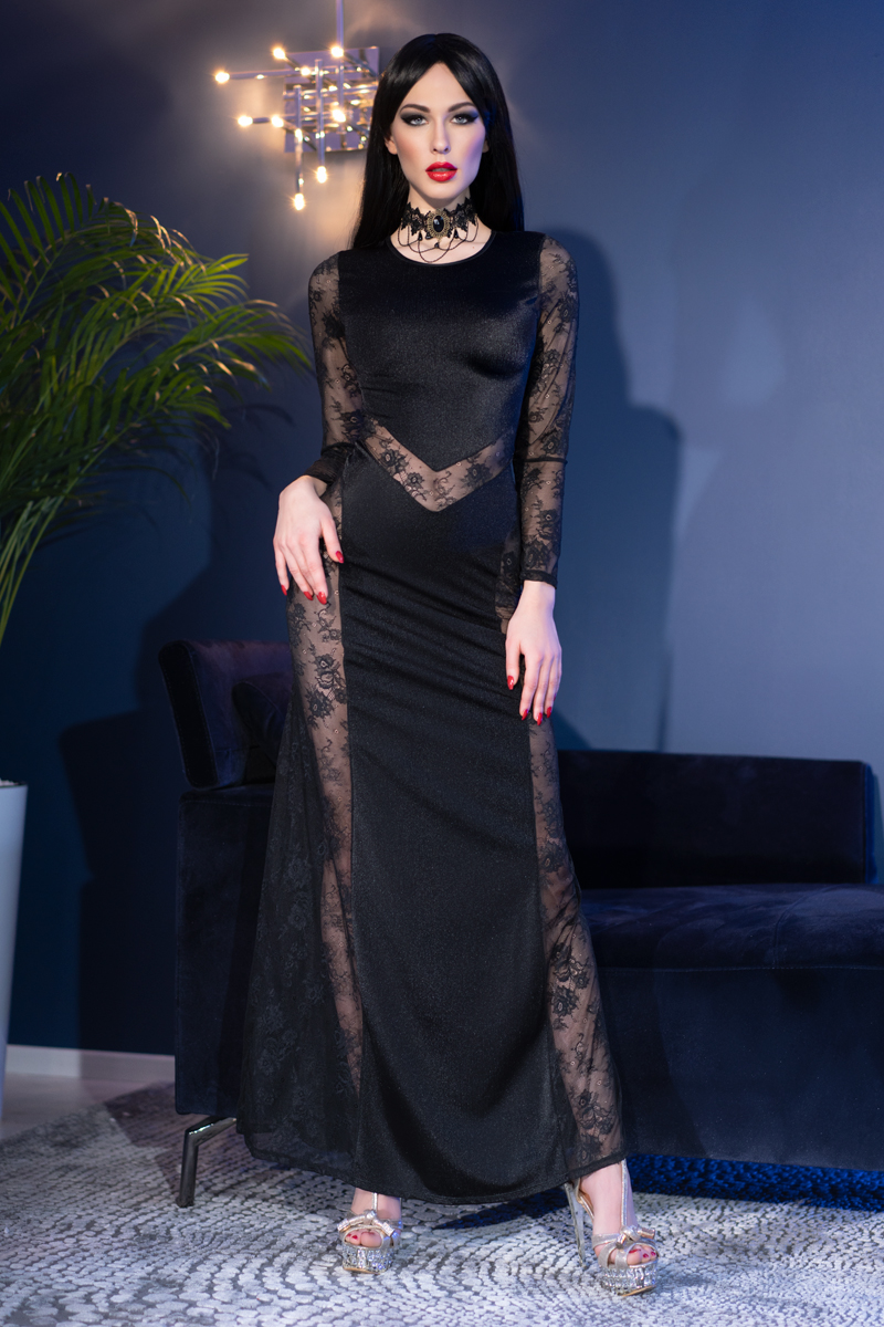 Cocktailkleid CR4408 schwarz (Chilirose) Langes Cocktailkleid aus schimmerndem Satinmaterial mit sexy Spitzeneinsätzen und langen Ärmeln. Das vertikale Design und der Volant schmeicheln Ihrer Figur. Passender String inklusive.