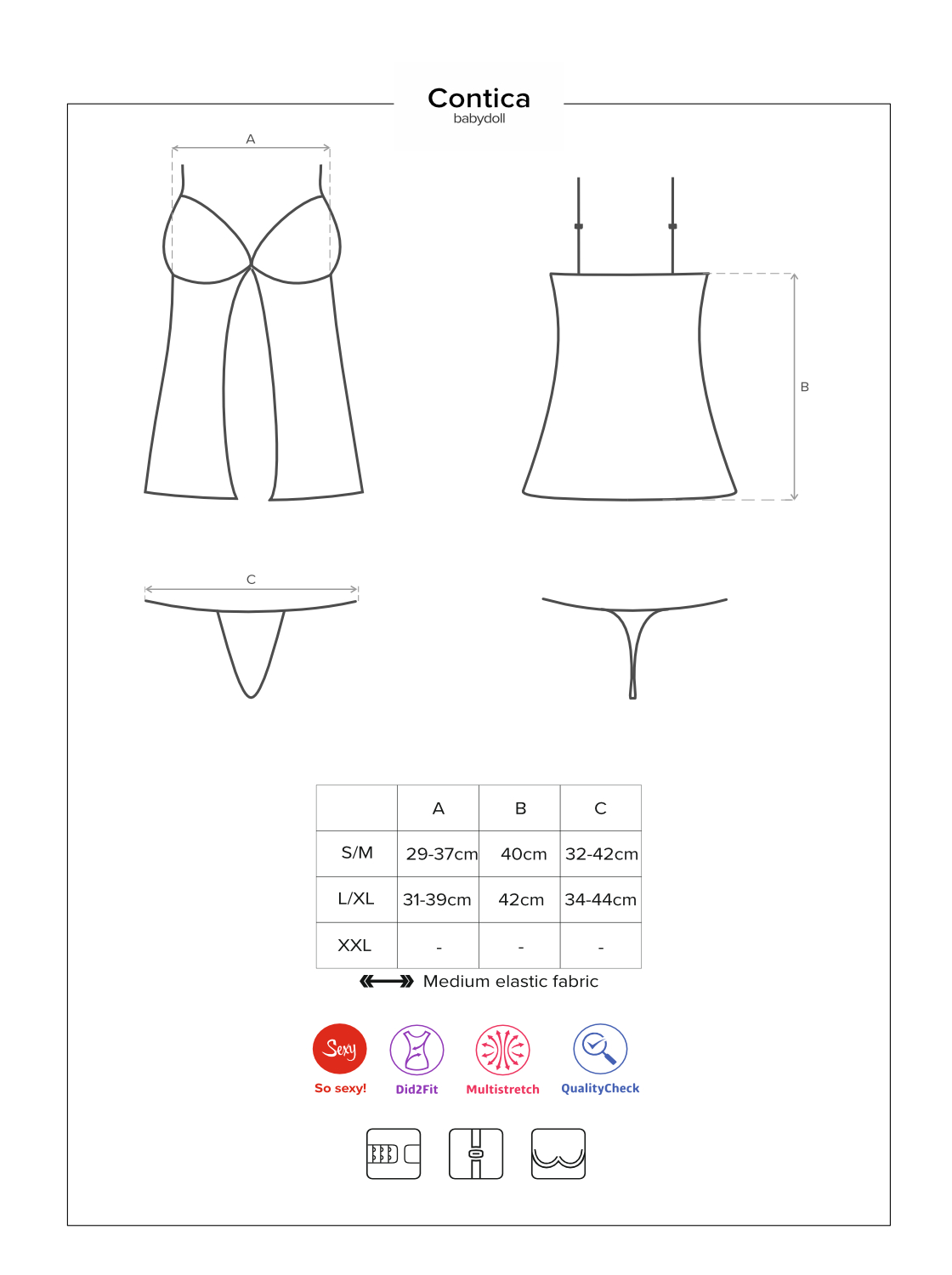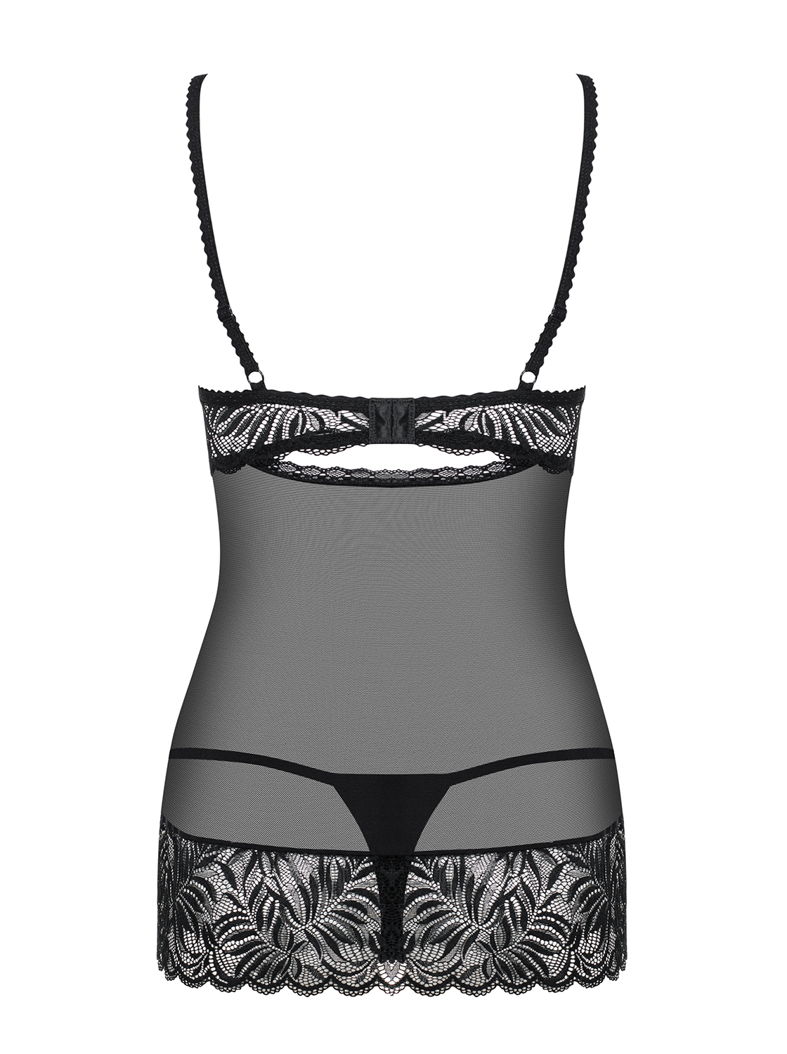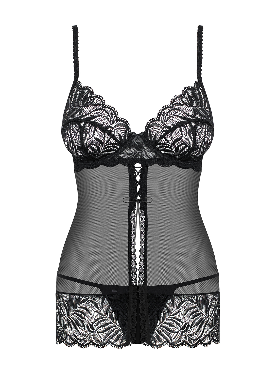 Schwarzes Babydoll aus transparentem Mesh und femininer Spitze mit einer Schleife und Schnürung aus Satinmaterial. Mit Bügel-Cups, verstellbaren Trägern und Verschluss für eine perfekte Passform. Passender String inklusive. Weiches und elastisches Multistretch-Material.