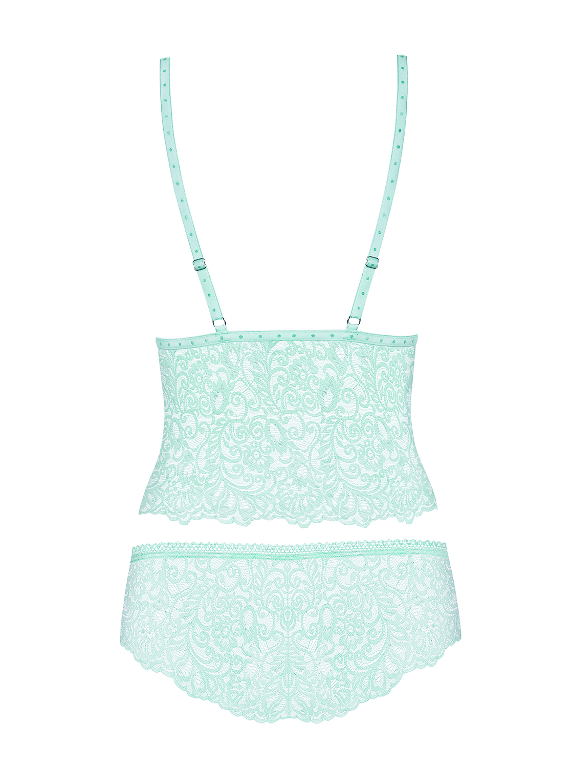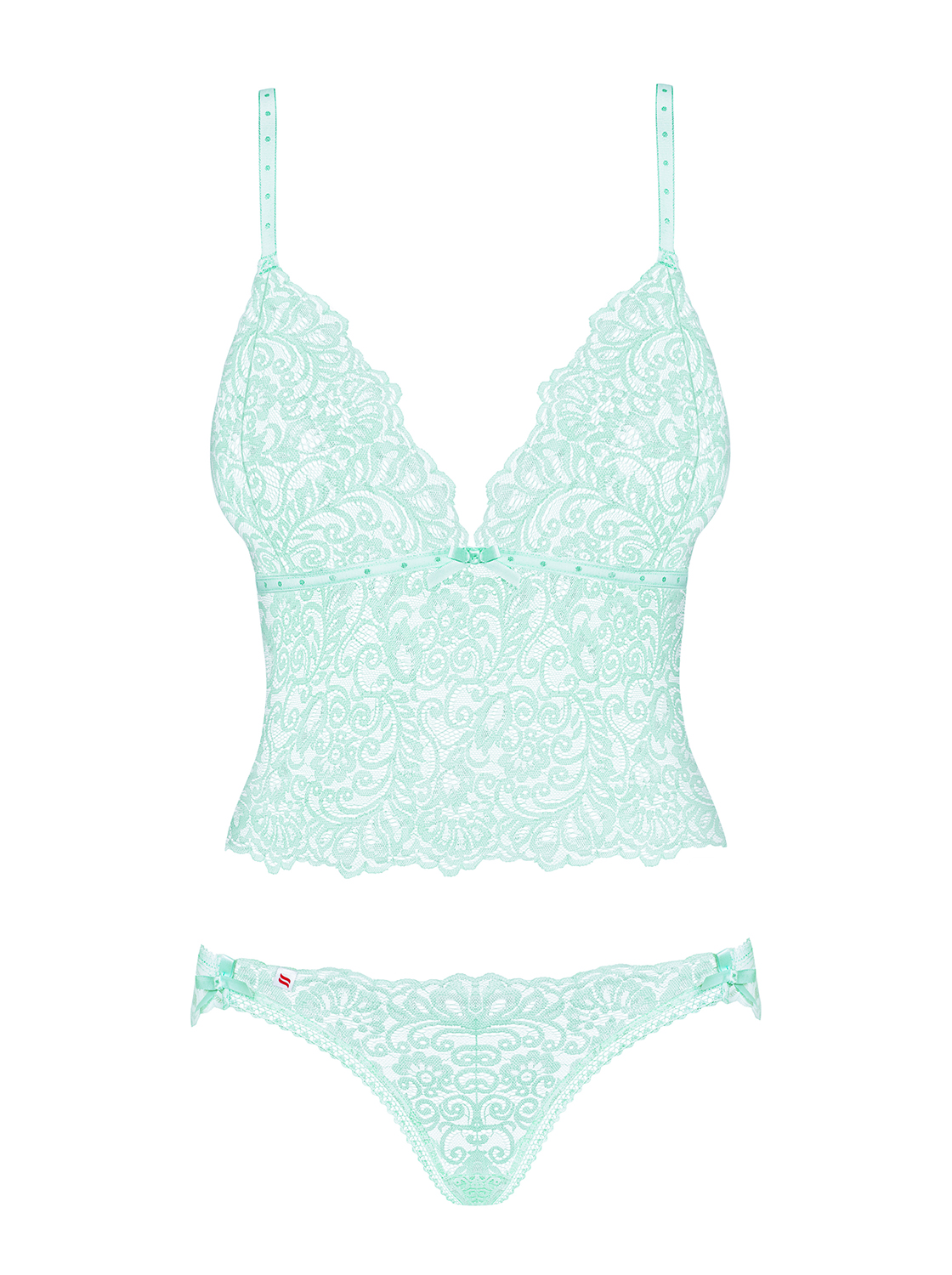 Wunderschönes, mintfarbenes Top mit passendem Höschen aus weicher und elastischer Multistretch-Spitze. Das knapp geschnittene Top hat Softcups und verstellbare Träger für eine perfekte Passform. Das elegante Spitzenhöschen betont Beine und Po. Verspielte Schleifen setzen einen charmanten Akzent.