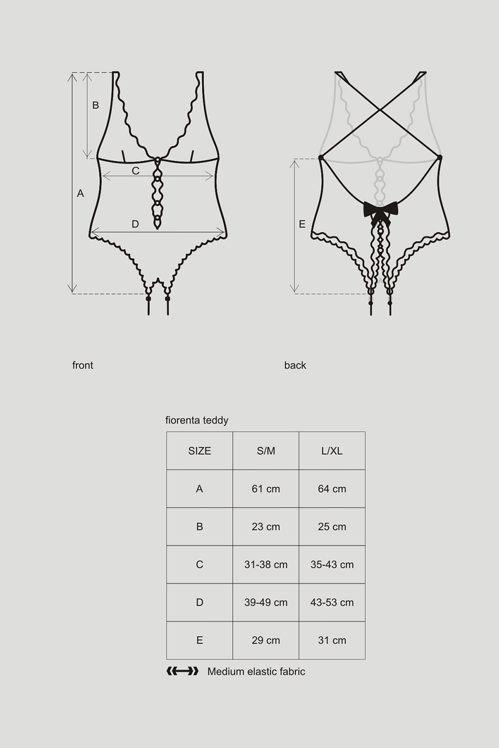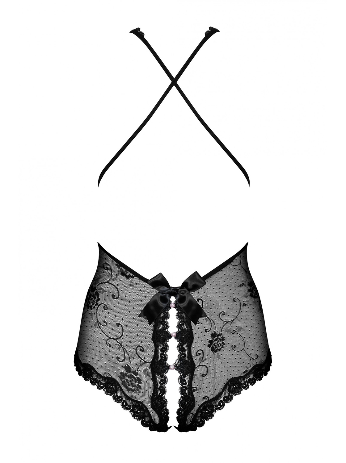 Femininer, schwarzer Body aus transparentem Material mit schönem Blumenmuster, offenem Schritt und Perlendetails am Bauch. Mit verstellbaren Trägern, die sich am Rücken kreuzen und mit einer süßen Schleife über dem Po.