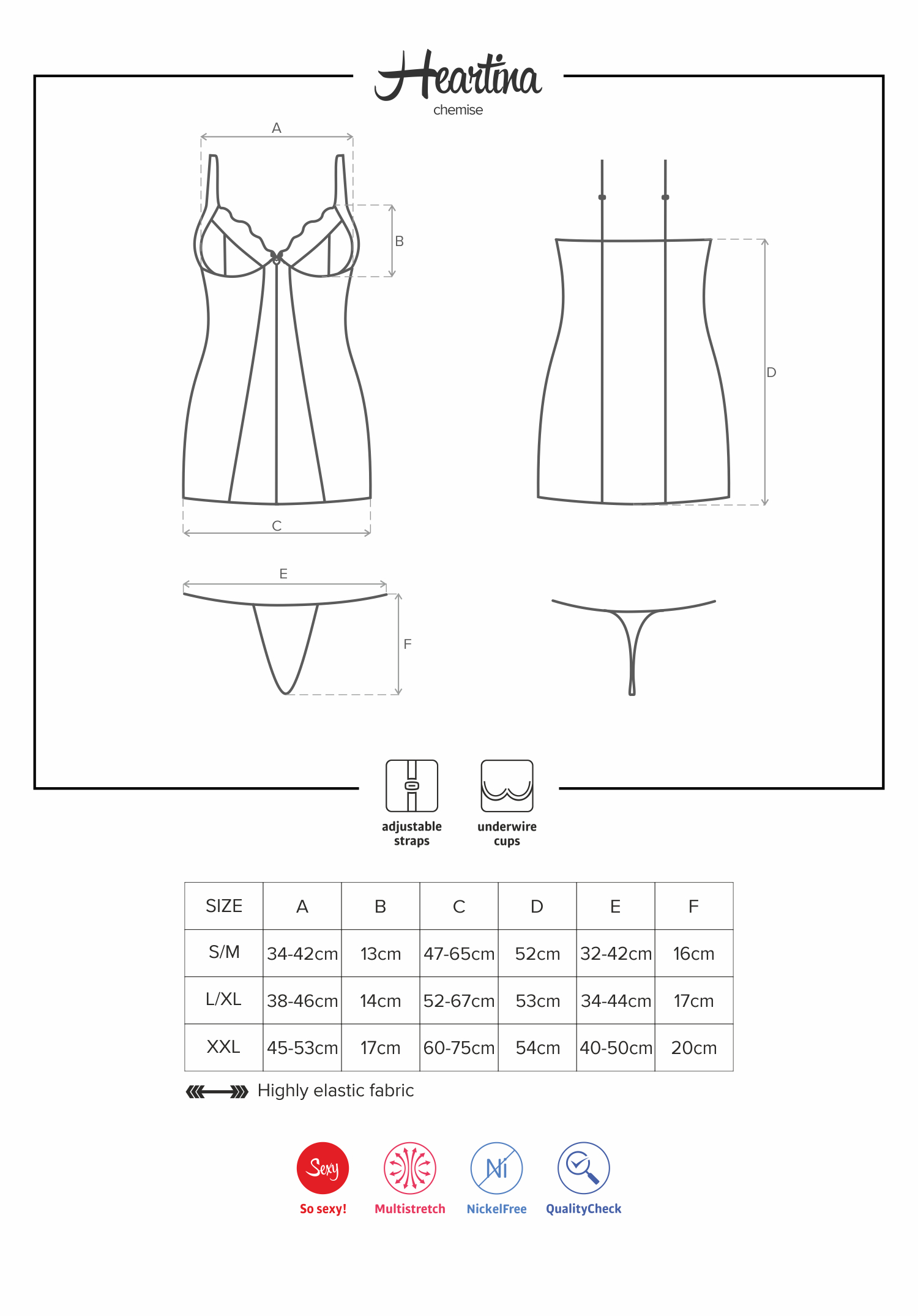 Reizvolles Chemise mit entzückenden, floralen Spitzendetails. Mit verstellbaren Trägern und Bügelcups für eine perfekte Passform. Ein nickelfreies Zirkondetail und eine Satinschleife zieren das Dekolletee. Passender String inklusive. Zartes und elastisches Material.