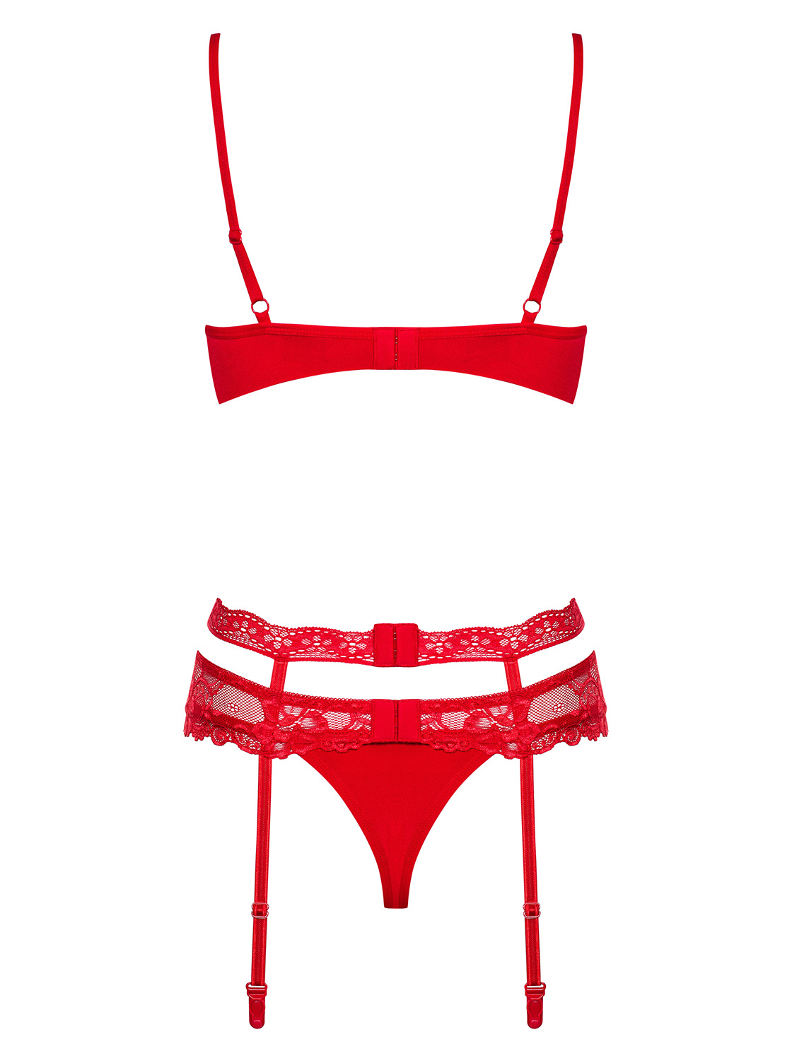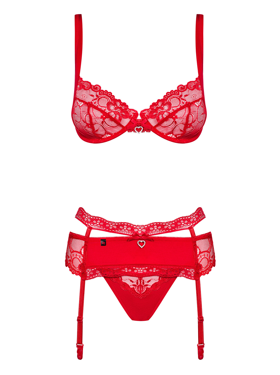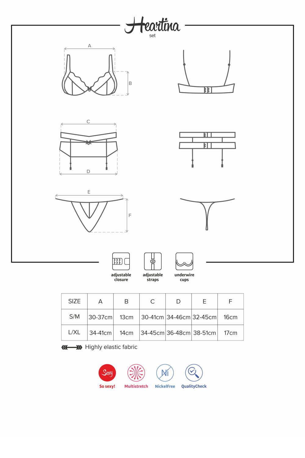 Sexy Bügel-BH aus floraler Spitze mit verstellbaren Trägern und Verschluss für eine perfekte Passform. Zwischen den Cups befindet sich ein nickelfreies Zirkondetail und eine Satinschleife. Ein fein verarbeiteter Strumpfhaltergürtel mit zusätzlicher Schnürung und zwei verstellbaren Verschlüssen sorgt für einen atemberaubenden Look. Passender String inklusive. Unglaublich weiches, elastisches Material.