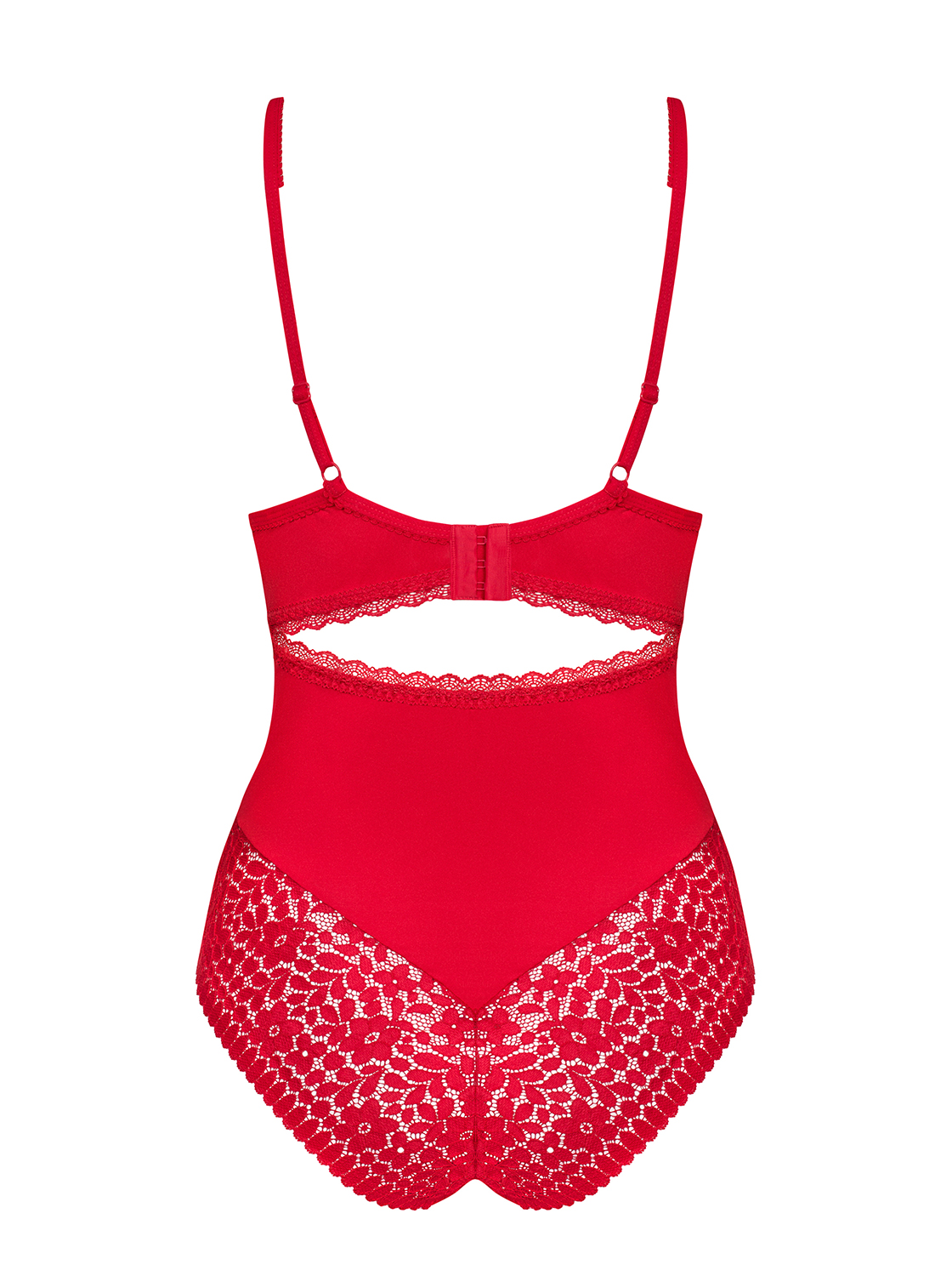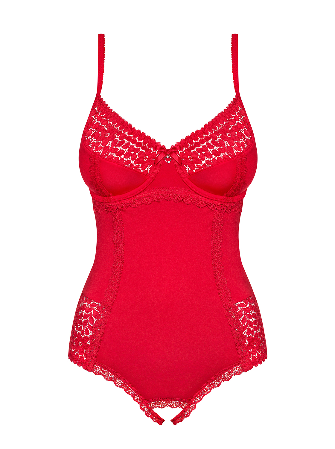 Schöner Body aus elastischem Multistretch-Material mit bezaubernder Blütenspitze und offenem Schritt. Mit großen, gepolsterten Bügel-Cups, dreistufigem Verschluss und verstellbaren Trägern für eine optimale Größenanpassung. Ein verführerischer Rückenausschnitt und ein wunderschöner, herzförmiger Anhänger mit einer Schleife und einem glänzenden Schmuckdetail setzen einen romantischen Akzent. Der Saum mit Gummizug passt sich perfekt verschiedenen Körperformen an.