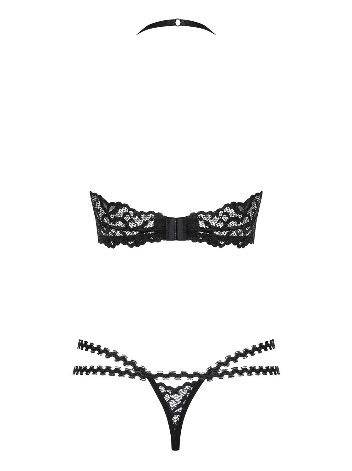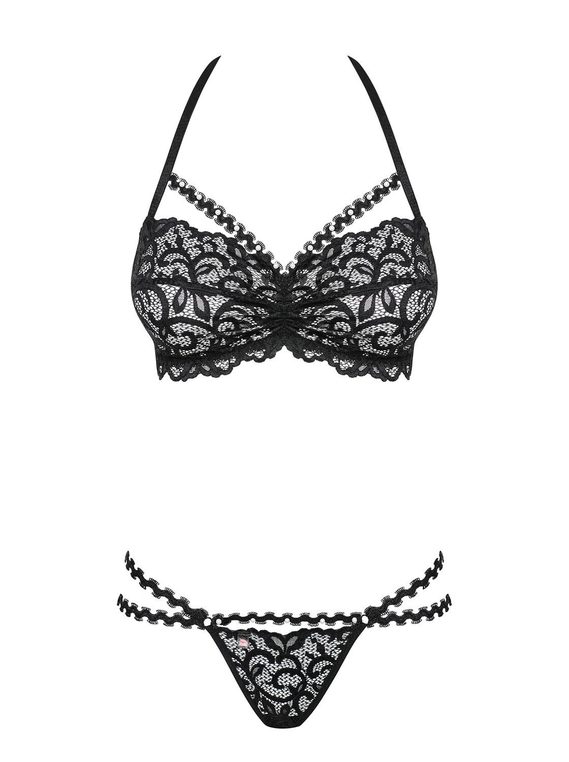 Joylace Set schwarz von Obsessive Zauberhaftes Spitzenset aus elastischem und weichem Multistretch-Material in schwarz. Ein BH mit verstellbarem Rückenverschluss und Neckholder für eine perfekte Passform. Mit luxuriösen Riemchen- und Perlendetails sowie zarter Spitze und Rüschen. Dazu ein passender String mit speziellem Design.