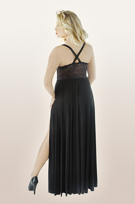 Langes Kleid aus elastischem, schwarzem Stoff, der entlang der Taille mit sexy Spitze kombiniert ist. Die Kreuzträger sorgen für eine perfekt sitzende Brust.