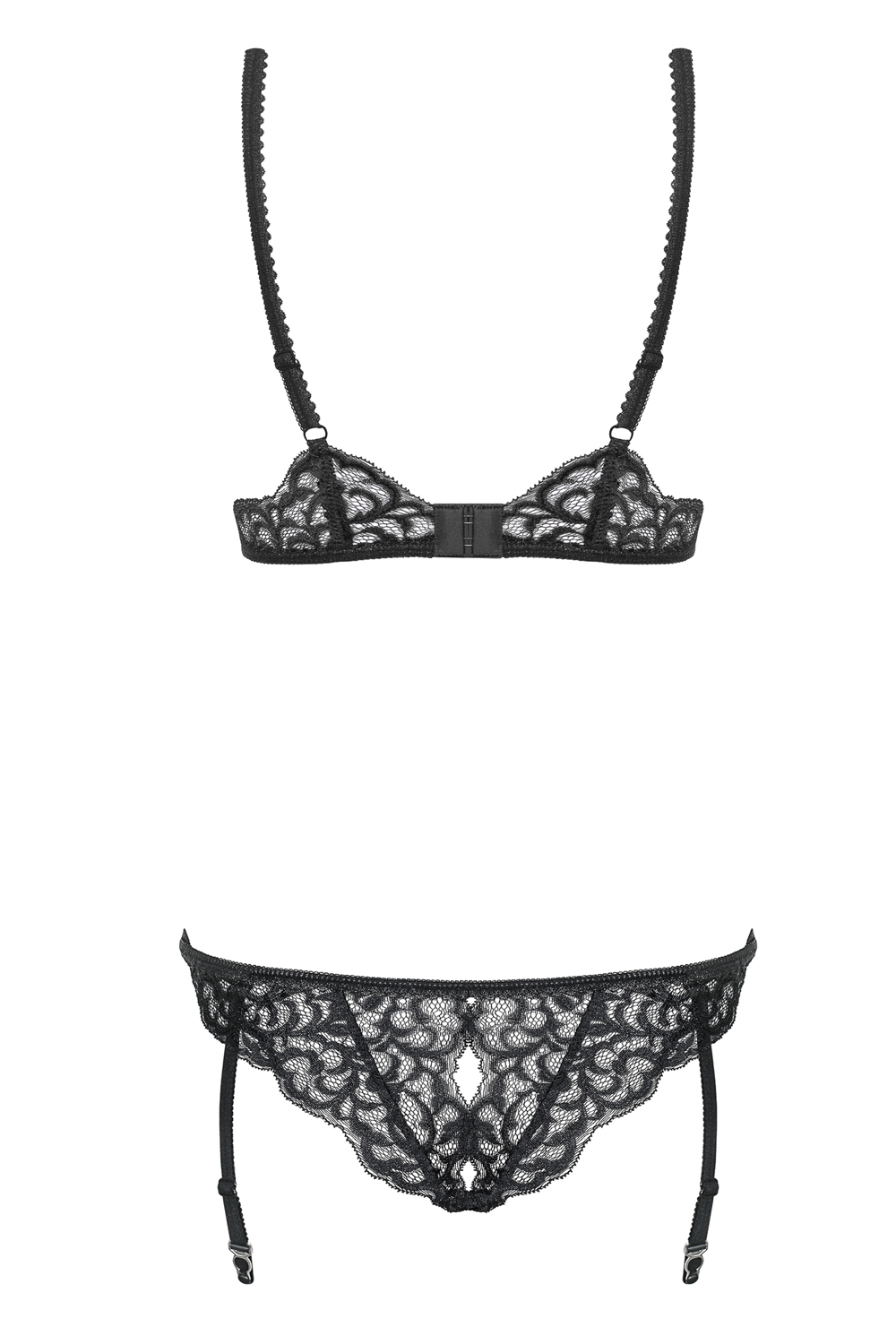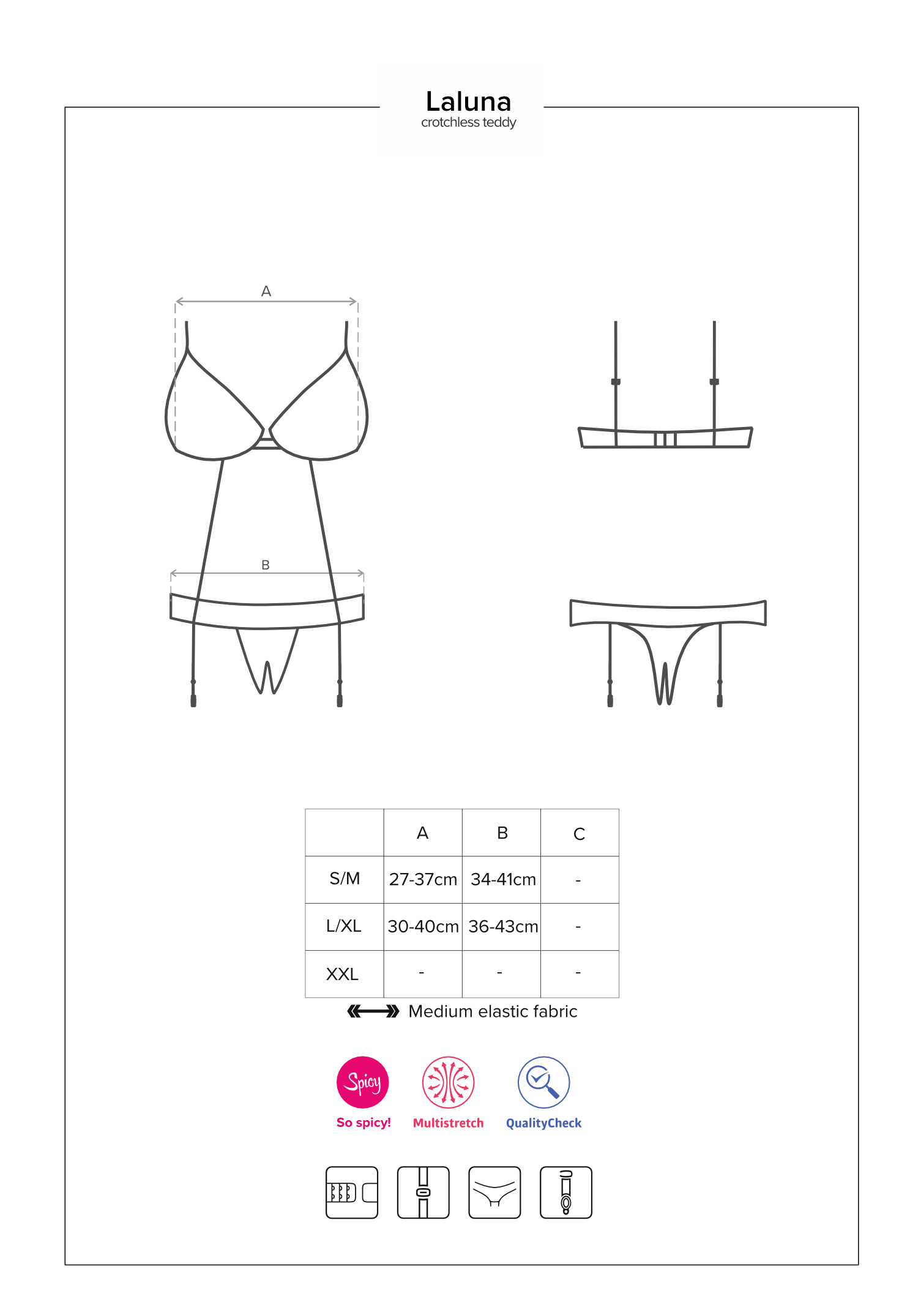 Laluna Crotchless Teddy schwarz von Obsessive Verführerischer Body aus glitzerndem Multistretch-Material und schöner Spitze mit einem eleganten Schmuckdetail und einer Schleife. Der BH mit verstellbaren Trägern und mehrstufigem Verschluss ist durch zwei Riemchen mit dem Höschen verbunden. Mit offenem Schritt und abnehmbaren Strumpfhaltern. Die abgebildeten Laluna Stockings sind nicht im Lieferumfang enthalten und separat erhältlich.