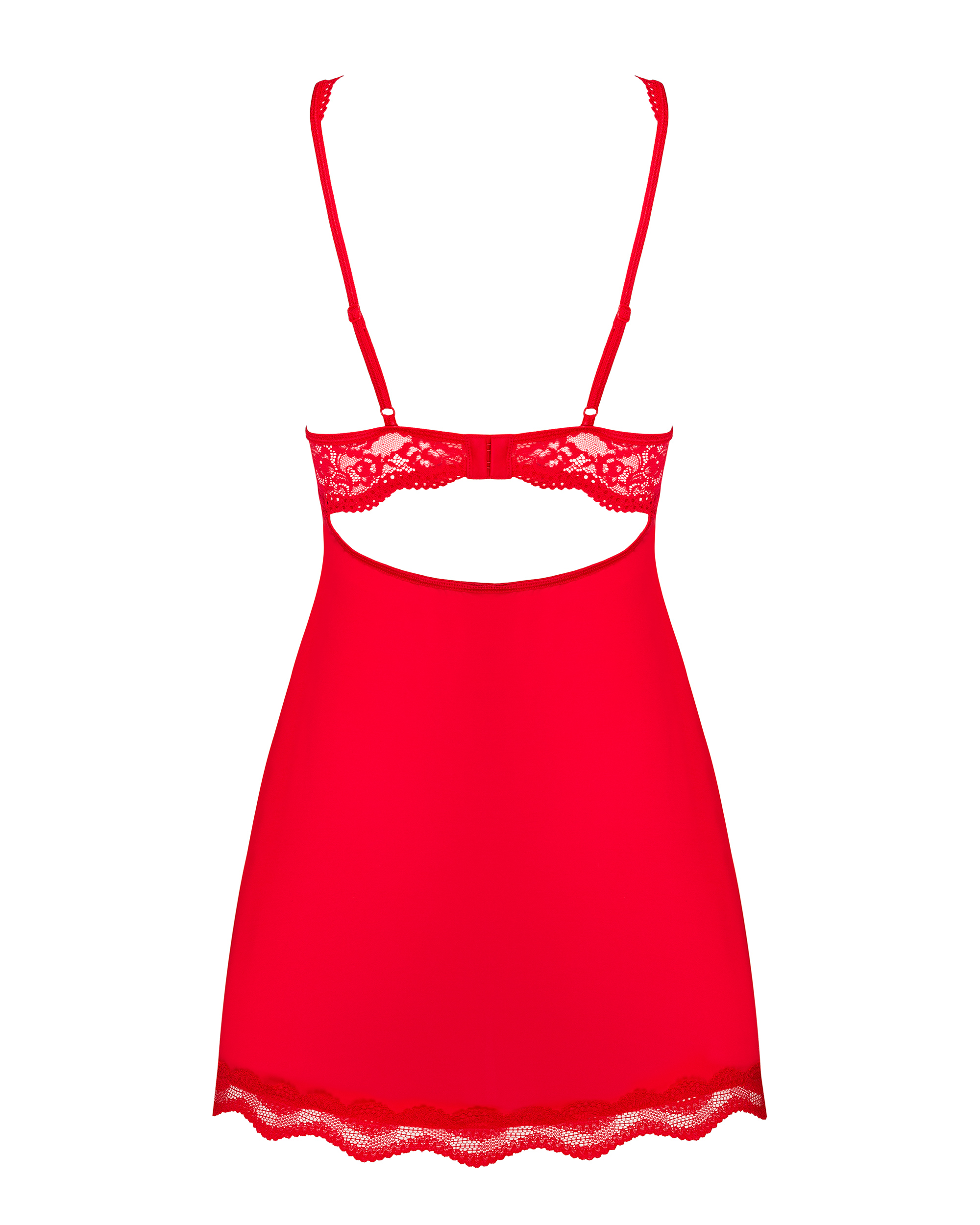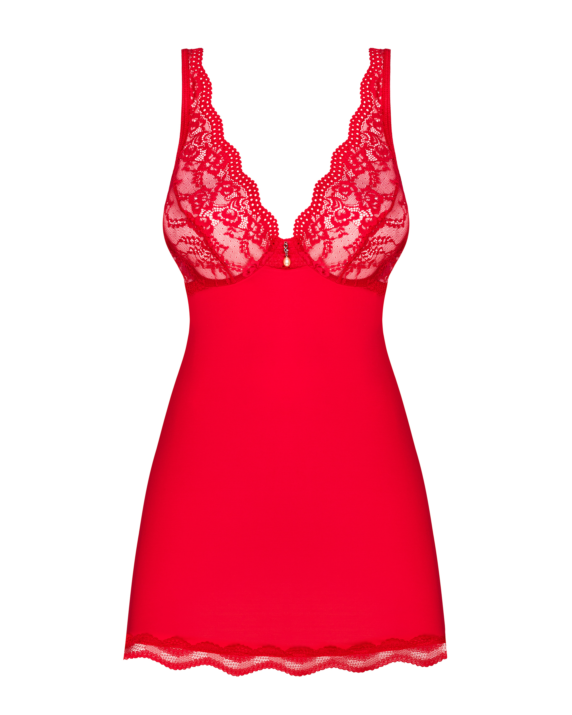 Rotes Babydoll aus weichem Multistretch-Material mit schöner Spitze. Mit verstellbaren Trägern, mehrfachem Rückenverschluss und Softcups für eine perfekte Passform. Mit einem schönen Perlenschmuckelement zwischen den Cups. Passender String inklusive.