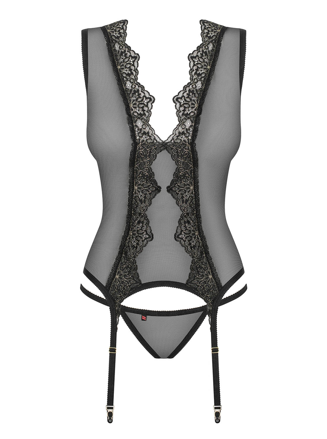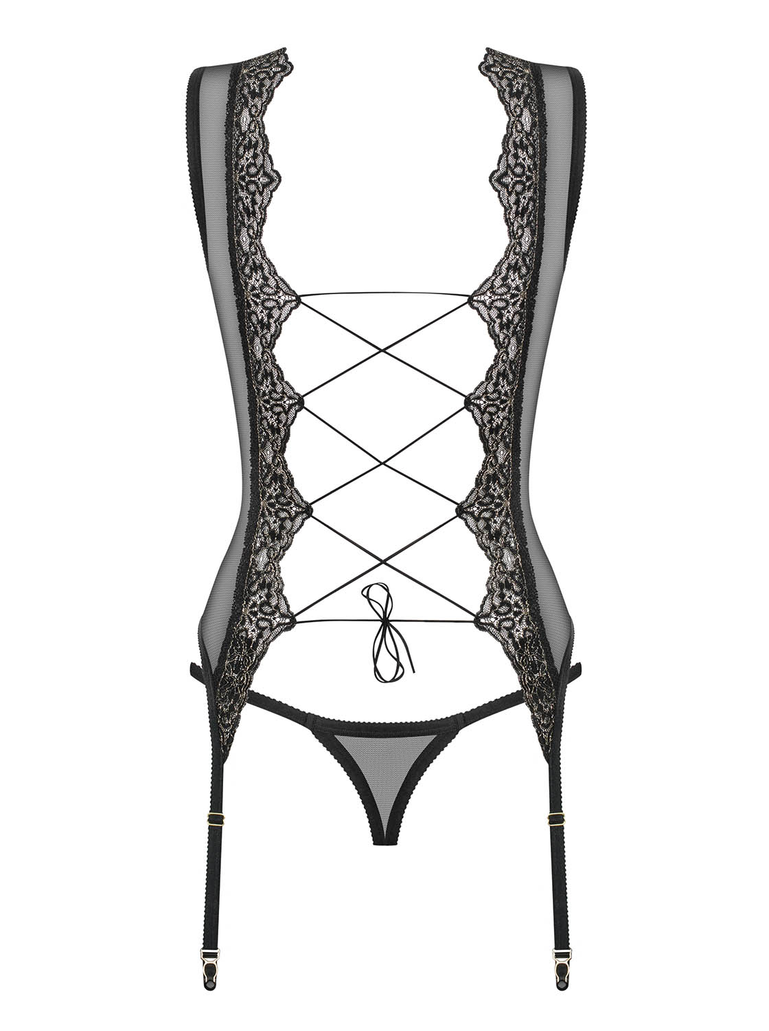 Feminine Corsage aus transparentem und elastischem Mesh. Mit einem einzigartigen Spitzenmotiv, das sich atemberaubend von den Schultern bis zur Hüfte erstreckt. Mit einer phänomenalem Rückenschnürung und verstellbaren Strumpfhaltern. Klassischer, schwarzer String inklusive. Die abgebildeten S800 Stockings schwarz sind nicht im Lieferumfang enthalten und separat erhältlich.