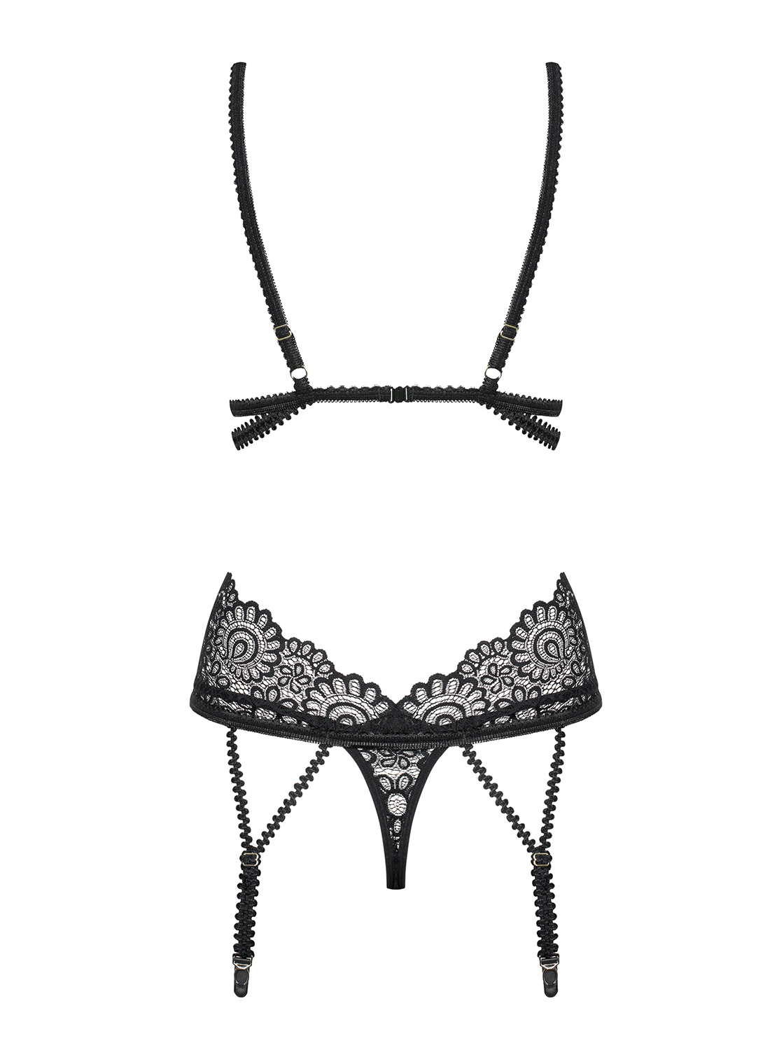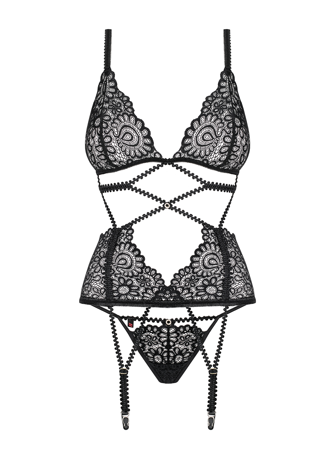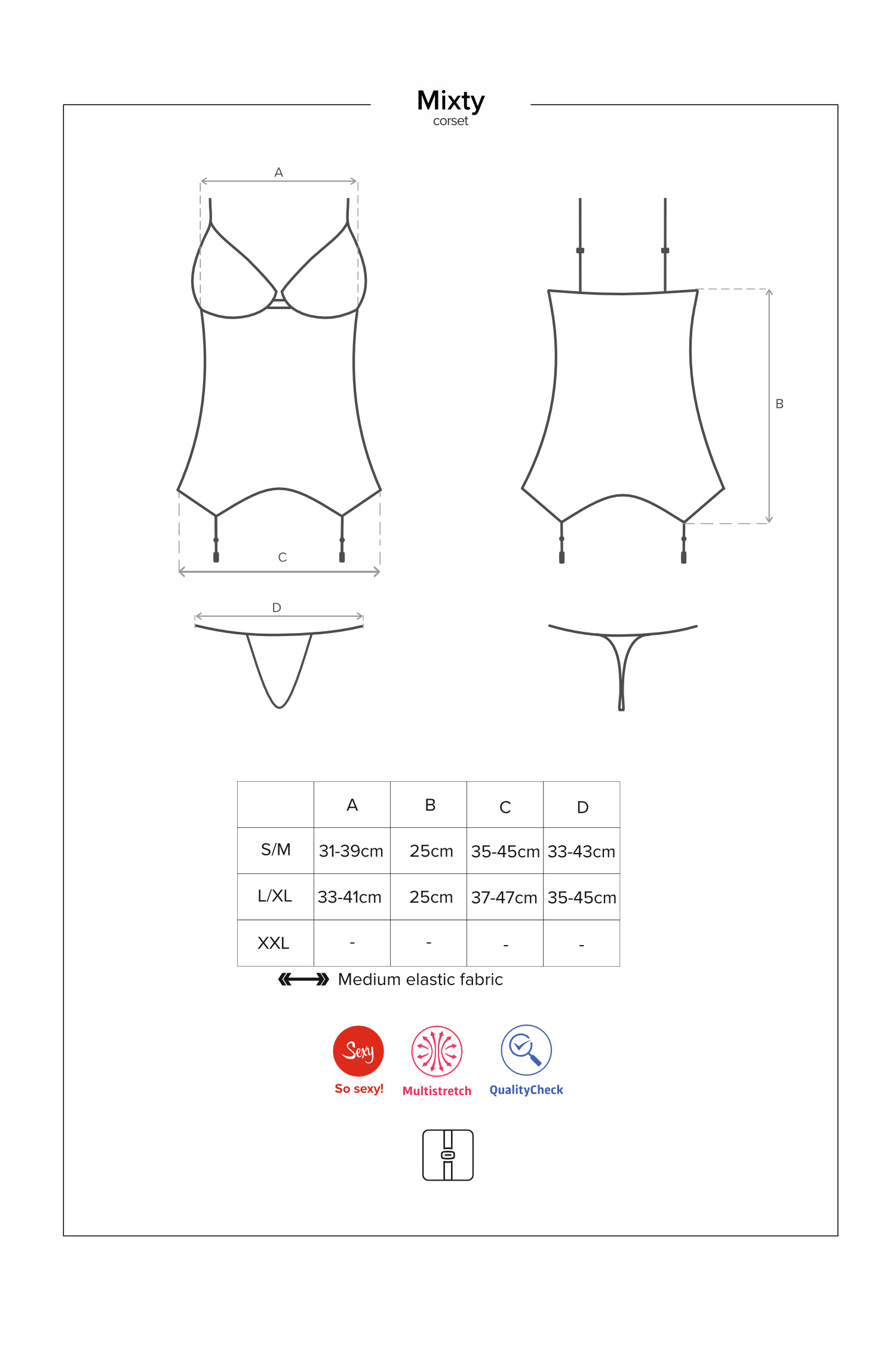 Wunderschöne Spitzencorsage aus zartem Multistretch-Material mit elastischen Riemchen. Mit Rückenverschluss, verstellbaren Trägern und Strumpfhaltern. Die Spitzen-Cups sind mit vertikalen Nähten verziert und zwei glänzende Schmuckdetails setzen einen luxuriösen Akzent. Passender String inklusive. Die abgebildeten Mixty Stockings sind nicht im Lieferumfang enthalten und separat erhältlich.