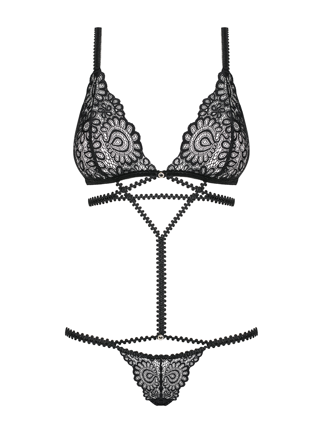Mixty Teddy schwarz von Obsessive Außergewöhnlicher Body mit eleganten Spitzen-Cups und elastischen Riemchen. Mit zwei verstellbaren Trägern und Rückenverschluss für eine perfekte Passform. Zwei glänzende Schmuckdetails setzen einen luxuriösen Akzent.