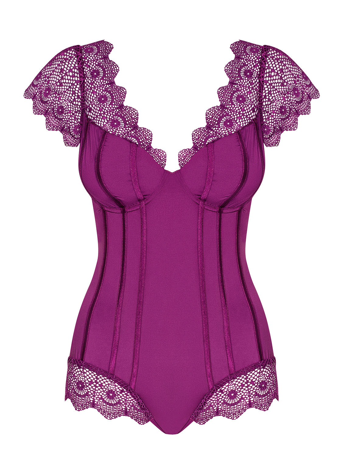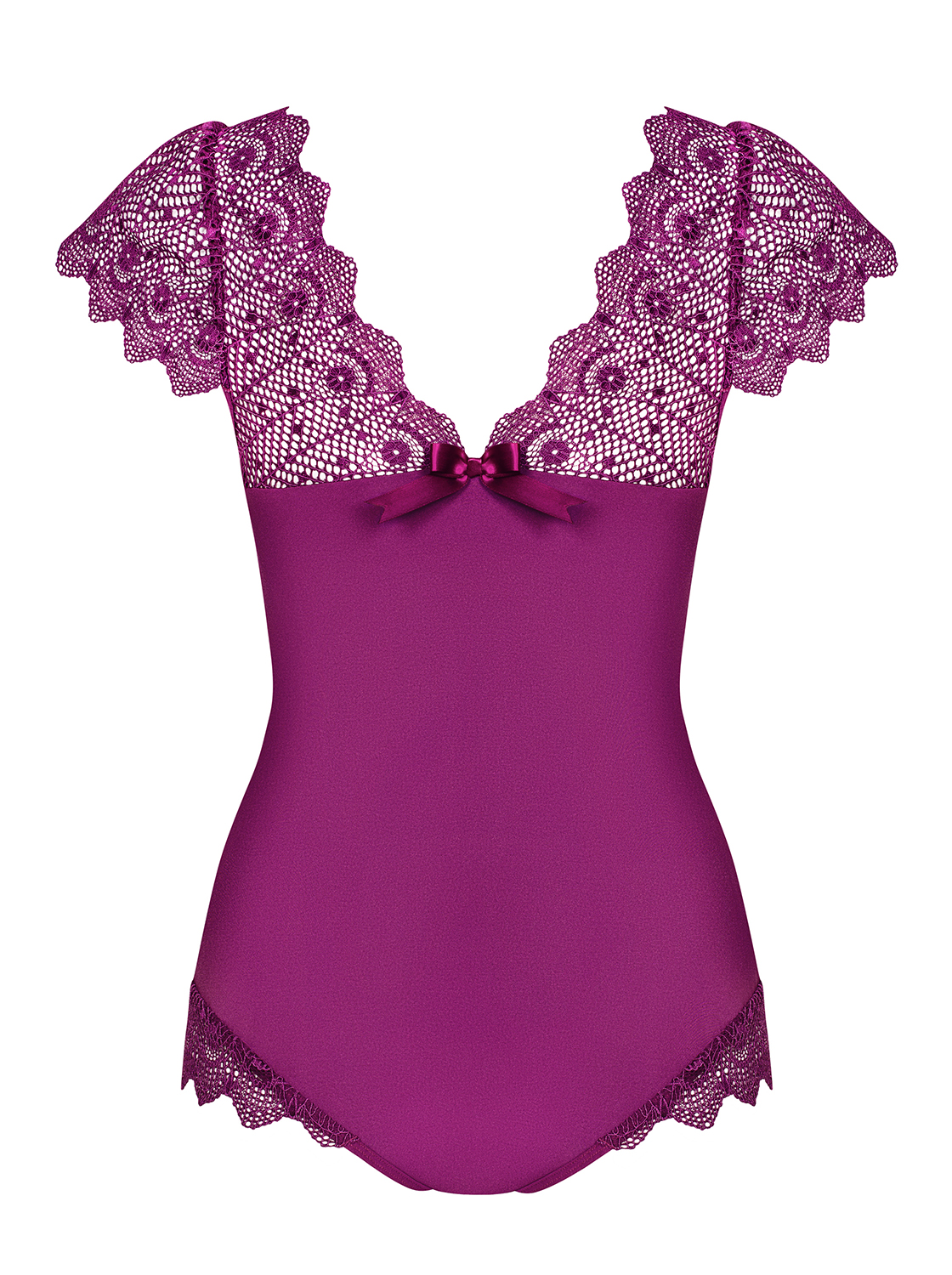 Violetter Body mit subtilem, femininem Design. Aus glattem und elastischem Material mit glänzenden, vertikalen Streifen, elastischen Trägern und Bügel-Cups für einen perfekten Tragekomfort. Verziert mit koketter Spitze und einer Schleife am Rücken. Mit verstellbarem Verschluss im Schritt.