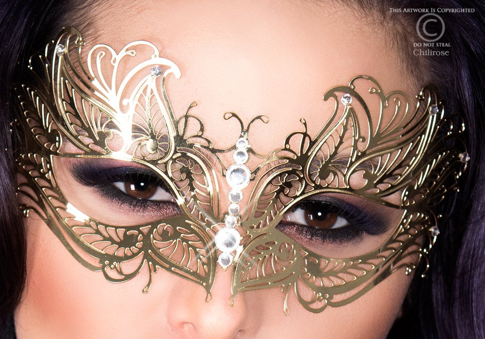 Mysterious Chili Mask von Chilirose CR3806 Diese geheimnisvolle Maske aus Messing ist verziert mit glitzernden Kristallen. Sie lässt sich mit Satinbändern festbinden und perfekt anpassen.