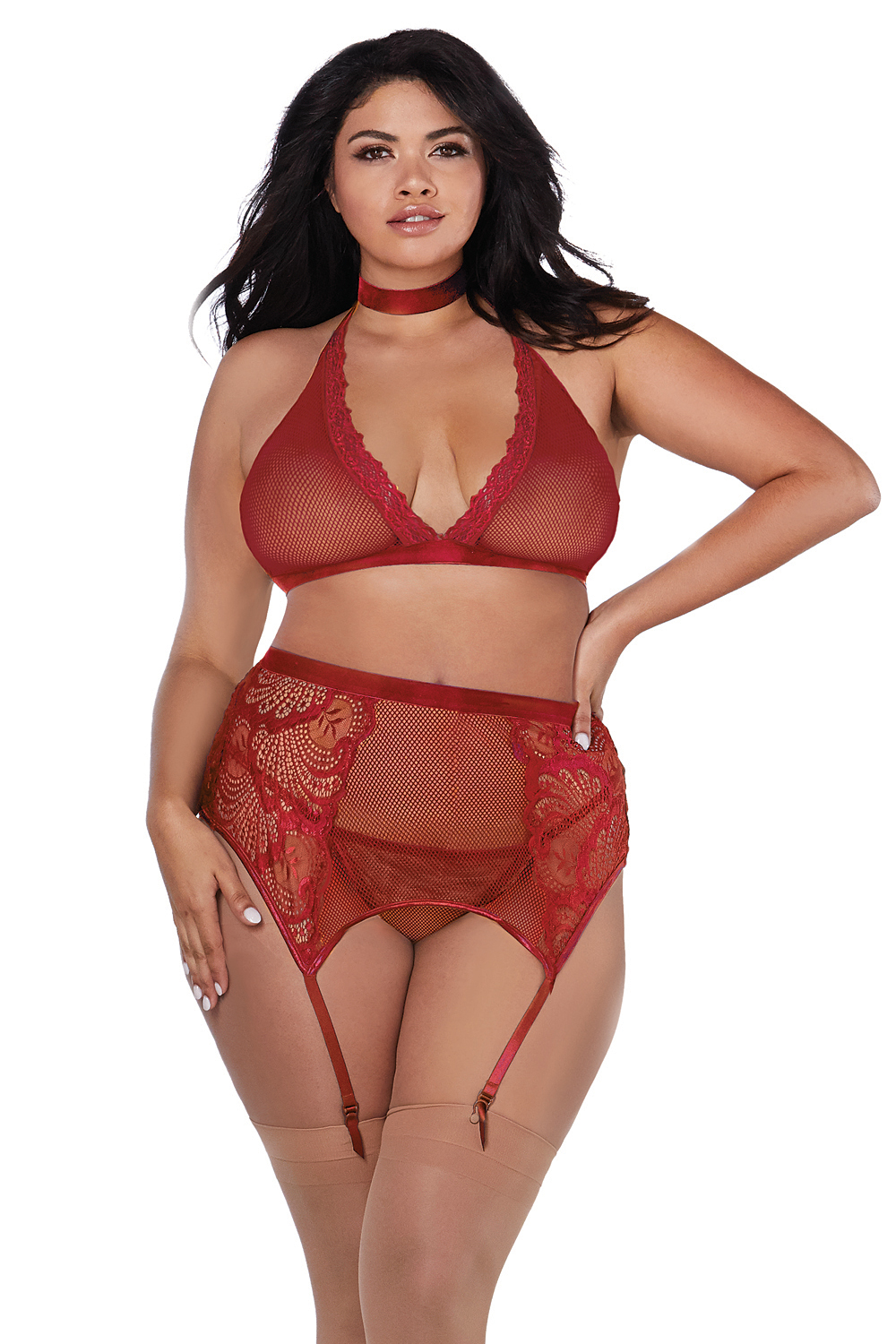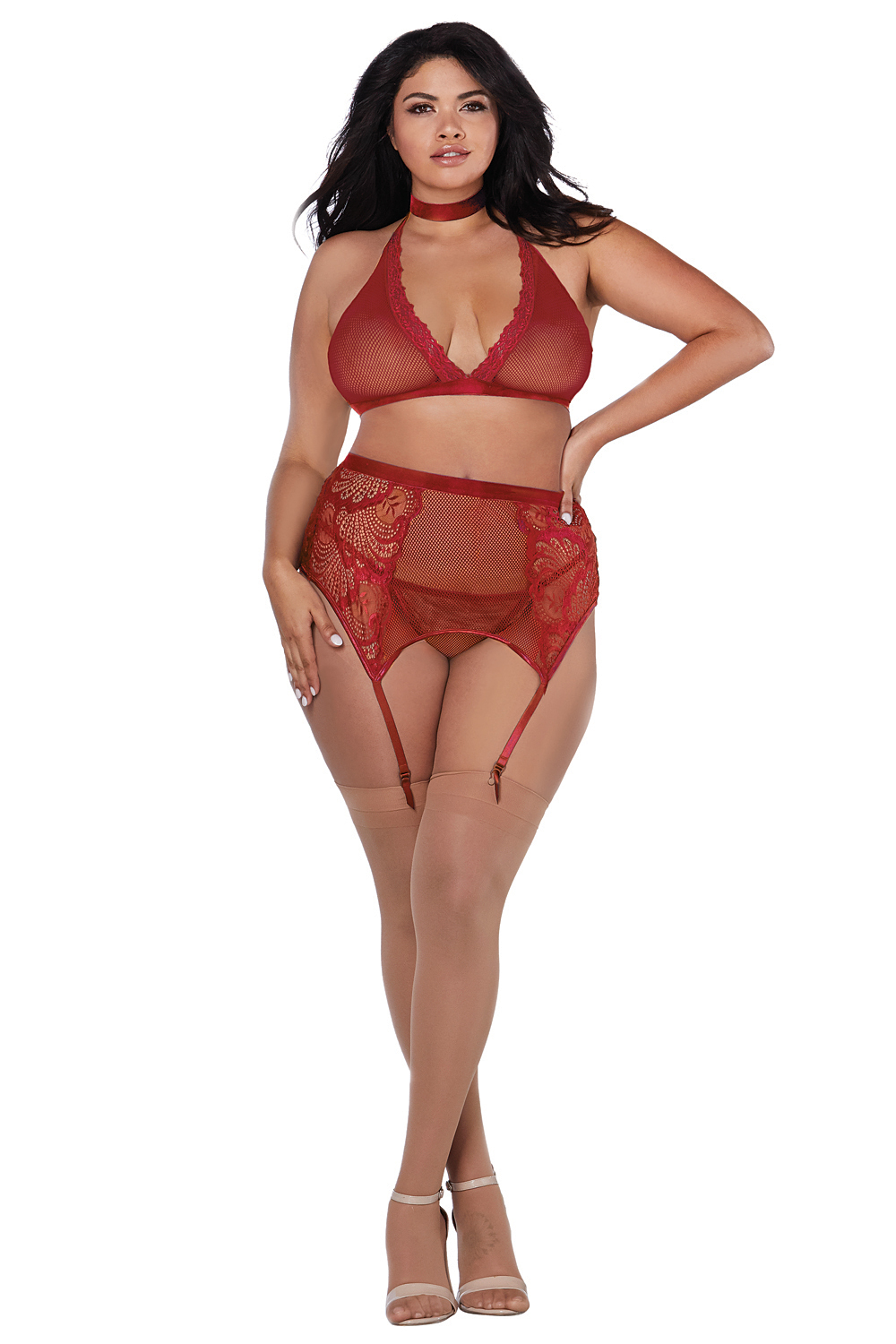 Vierteiliges Set aus Netzmaterial und Spitze mit elastischen Satinakzenten. Ein Neckholder-Bralette mit verstellbaren Verschlüssen auf der Rückseite. Ein Strumpfhaltergürtel mit befestigten, verstellbaren Strumpfhaltern und verstellbarem Bund. Passender Netz-String und Samt-Choker inklusive. Die abgebildeten Strümpfe DR0007 sind nicht im Lieferumfang enthalten.