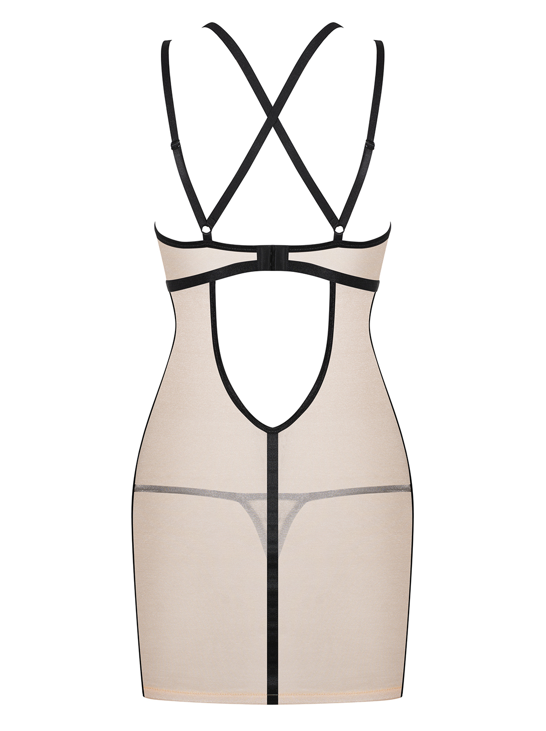 Einzigartiges Chemise aus transparentem und goldschimmerndem Material in Hautfarbe mit schwarzem Streifendesign und dreieckigen Ausschnitten über der Brust und dem Po. Mit verstellbaren Trägern, die sich am Rücken kreuzen, und mehrstufigem Verschluss für eine perfekte Passform. Passender String inklusive. Weiches und elastisches Material, das sich perfekt dem Körper anpasst.