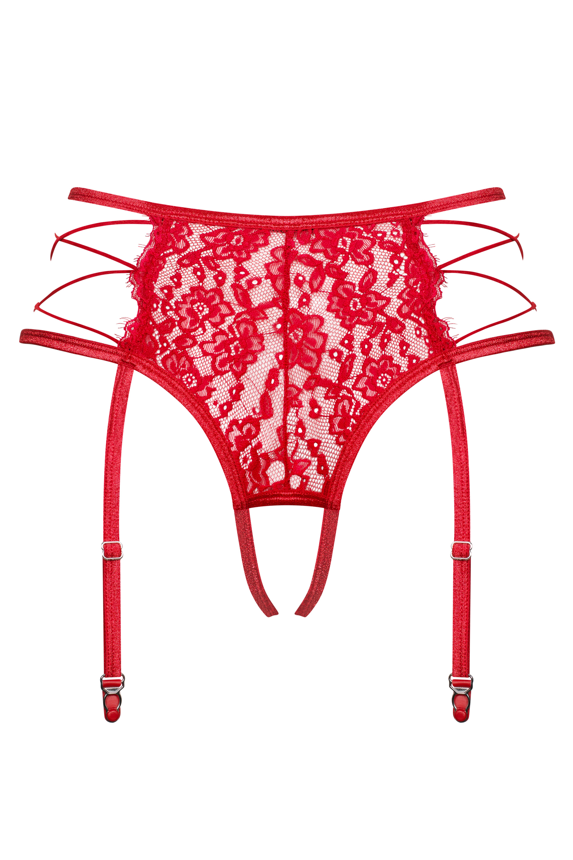 Rediosa Garter Belt rot von Obsessive Roter Strumpfhaltergürtel und integrierter String in einer reizenden Kombination aus transparenter Spitze und ineinander verschlungenen Riemchen an den Seiten. Mit verstellbaren Strumpfhaltern und Trägern im offenen Schritt für eine perfekte Passform. Angenehmes und elastisches Material.