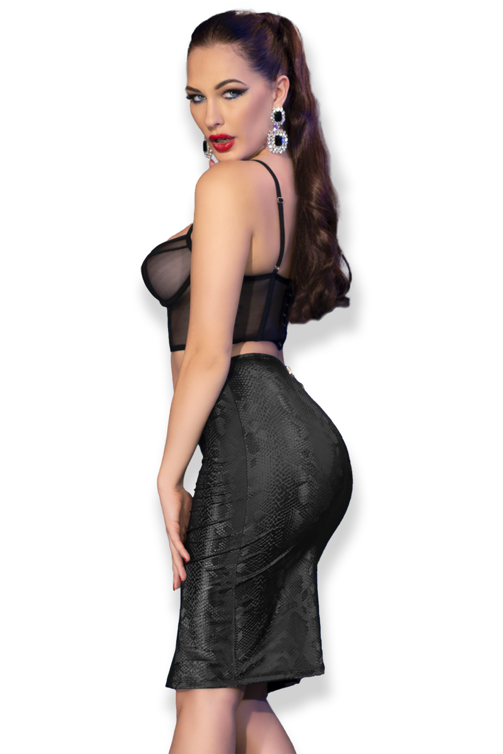 Rock CR4613 snake von Chilirose Exotischer Rock aus weichem und lederähnlichem Material mit Schlangenmuster-Print und einem silberfarbenen Reißverschluss auf der Rückseite.