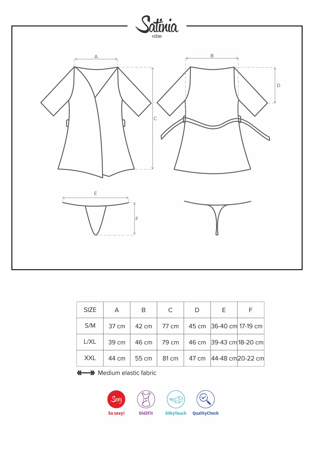 Satinia Robe schwarz von Obsessive Sexy Robe aus glänzendem Satinmaterial in schönem Schwarz. Sie wird mit einem breiten Satingürtel gebunden. Die 3/4-Ärmel sind mit einem Guipure-Einsatz verziert. Passender String enthalten.