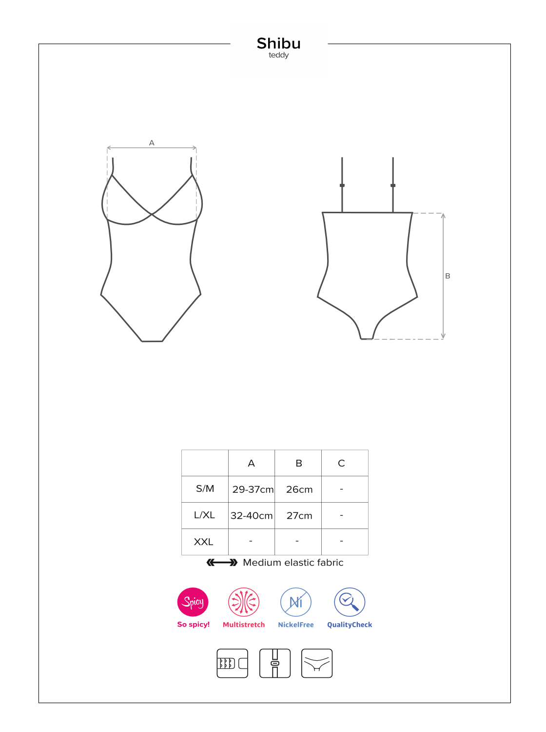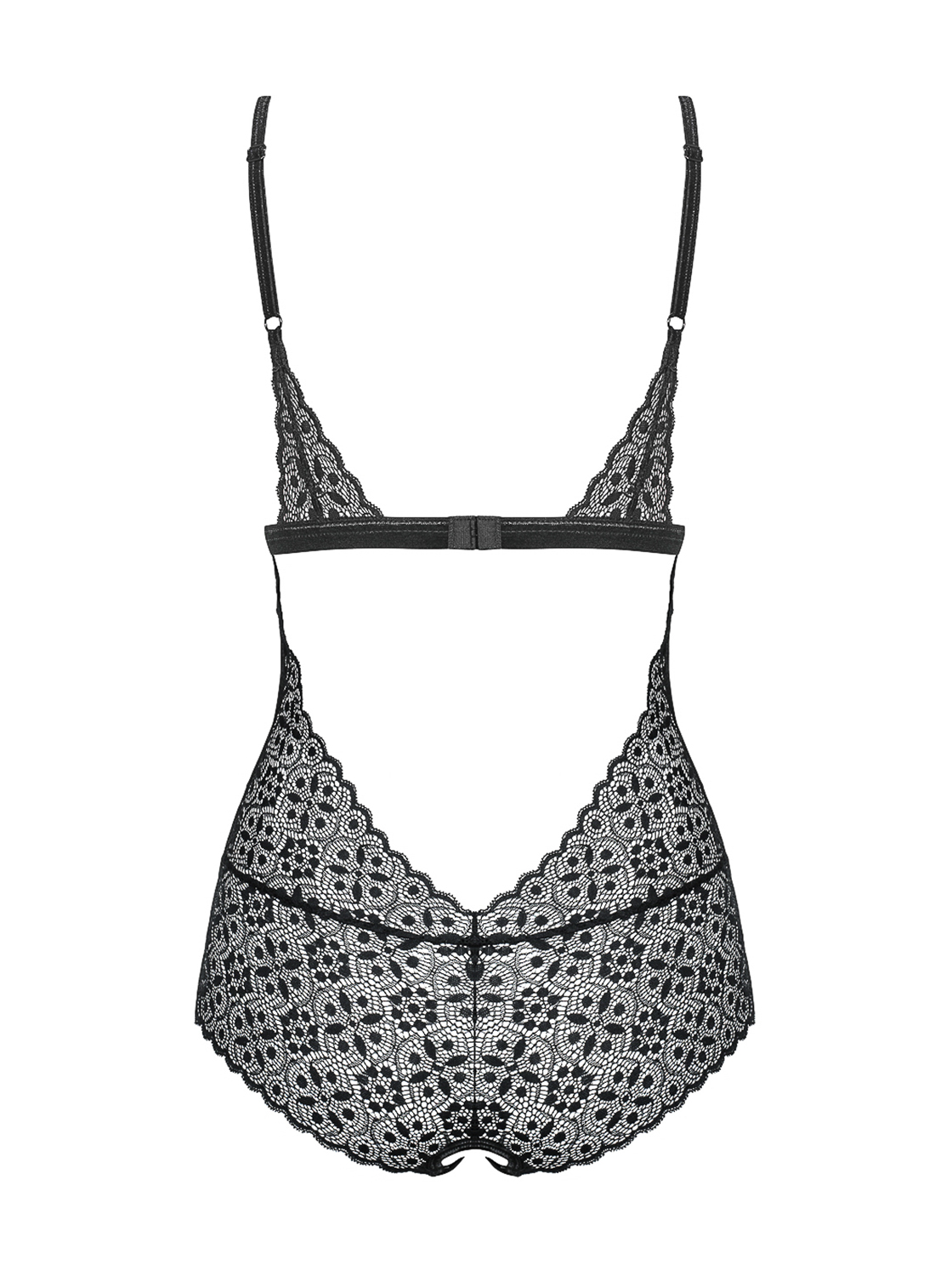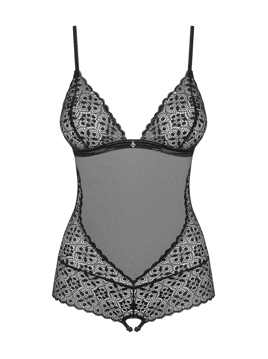 Verführerischer, schwarzer Teddy aus transparentem Mesh mit geometrischer Spitze und speziellen Nähten, die Ihre weiblichen Rundungen betonen. Im Schritt offen, mit mehrstufigem Verschluss und verstellbaren Trägern und Riemchen im Schrittbereich. Mit großem Rückenausschnitt und charmantem Schmuckdetail auf der Vorderseite. Weiches und sehr elastisches Material.