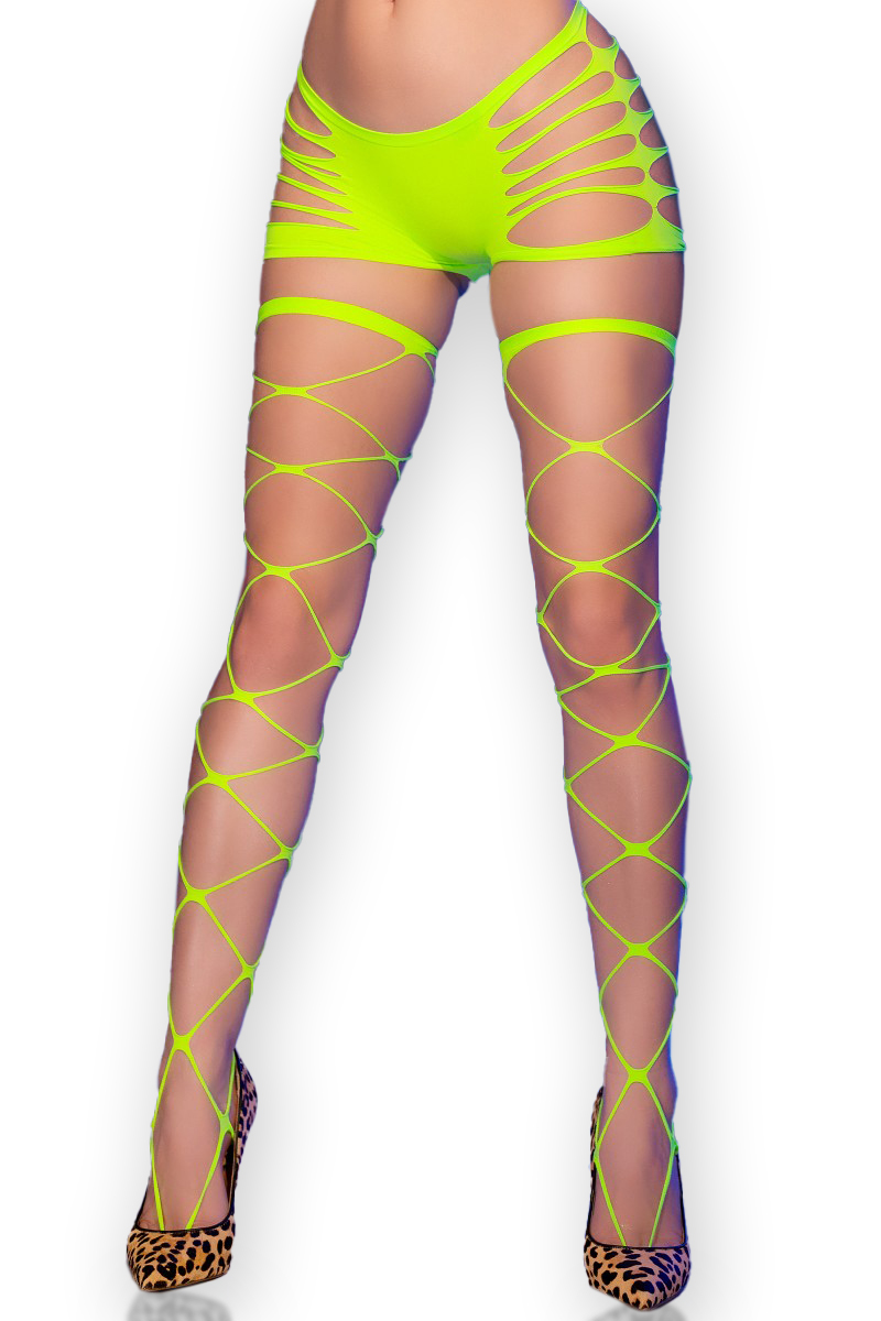 Auffällige Strümpfe in leuchtendem Neongrün, die durch ihr extravagantes Design mit großen Ösen die Beine verführerisch in Szene setzen. Fußlos gearbeitet, bieten sie maximale Bewegungsfreiheit und einen modernen, gewagten Look. Ideal für Partys, Performances oder besondere Anlässe.