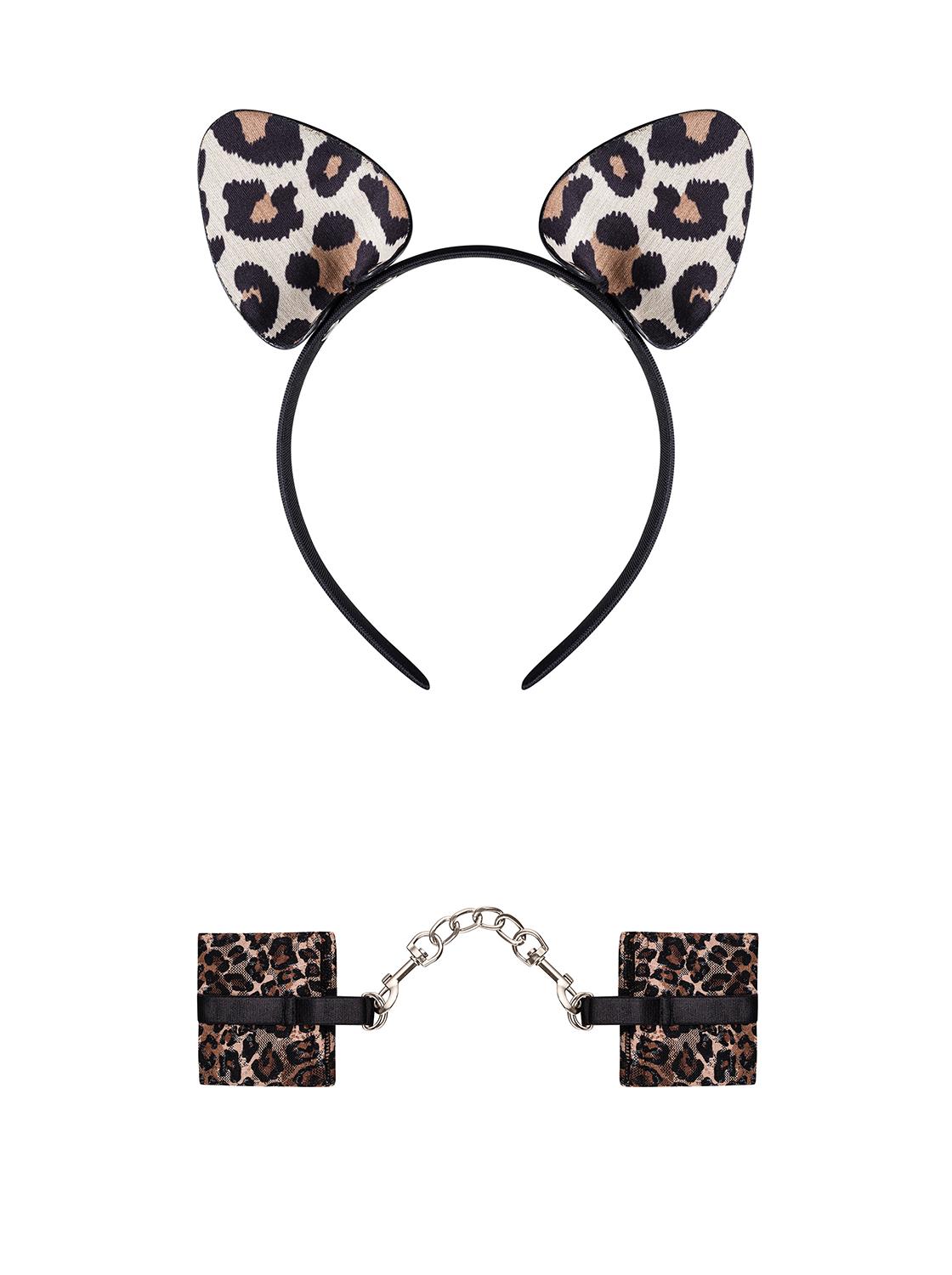 Weiche Handfesseln und ein Haarreif mit Katzenohren. Aus hautfreundlichem Material mit wildem Animal Print. Die Metallkette ist abnehmbar.