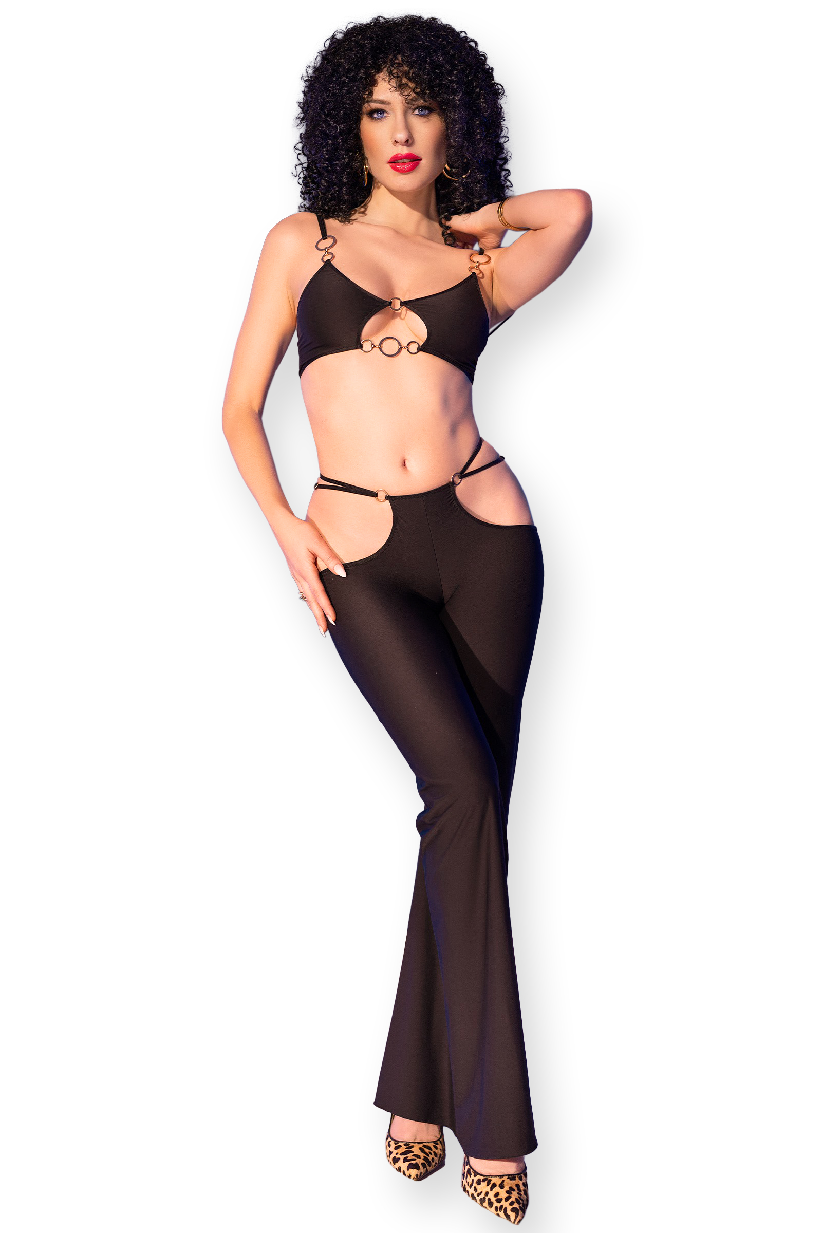 Ein sinnliches und unwiderstehlich stilvolles Set, das durch seine Finesse besticht. Das weiche, zarte Material schmiegt sich an den Körper und hebt seine Vorzüge hervor. Das mit Goldringen verzierte Oberteil verleiht einen Hauch von Eleganz. Die Hose mit den verspielten seitlichen Ausschnitten lässt die Hüften dezent hervortreten und zieht die Blicke auf sich. Goldfarbene Details runden den Look ab und verleihen Ihnen einen Hauch von Luxus. Das perfekte Outfit für selbstbewusste Frauen, die es lieben, mit Klasse zu flirten.